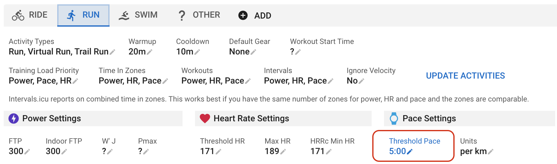You need to fill in your 5k time on your Zwift profile using your Intervals.icu threshold pace to calculate the time. In these screenshots my threshold pace is set to 5 mins/km. So I have captured 25m for my 5k time:
