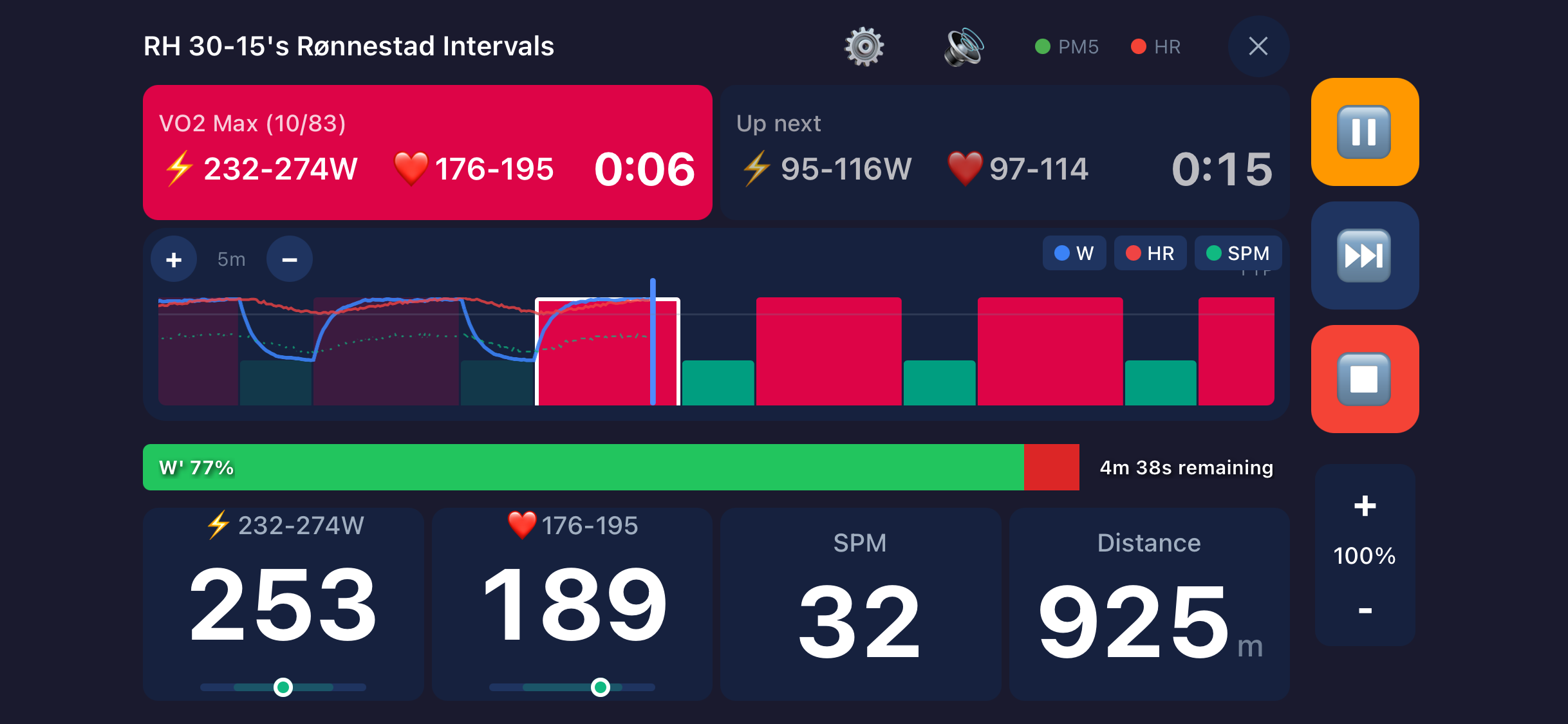 Rowing can be a very anaerobic sport - much more than cycling at least. So the feature I’ve had the most fun with is kind of silly but I like it: live W’ balance during your workout - your anaerobic fuel gauge, calculated using the same differential model as Intervals.icu uses in post-workout analysis.