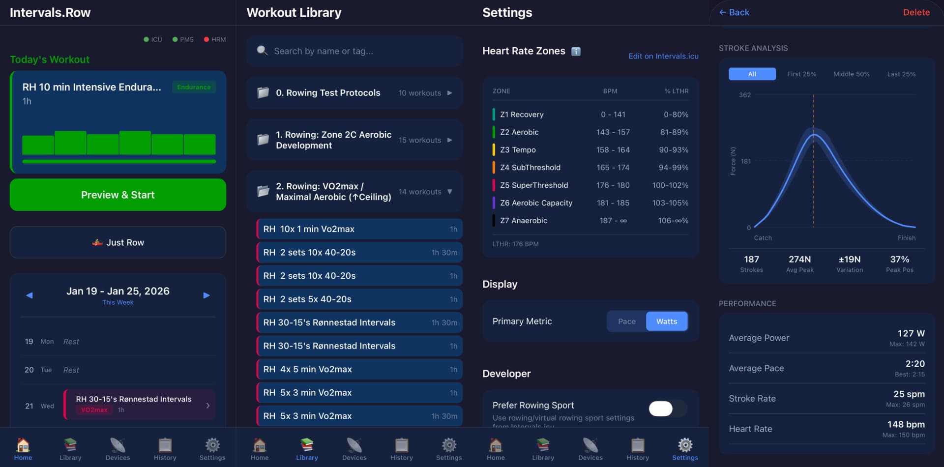 - Execute with Intervals.Row - Open the app, see today’s workout (or pick one from your workout library instead), connect to PM5, follow the workout