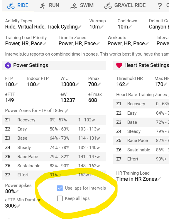 With only “Use laps instead of detecting intervals” I get all the intervals and I get the desired result of just my work intervals falling under “Work”