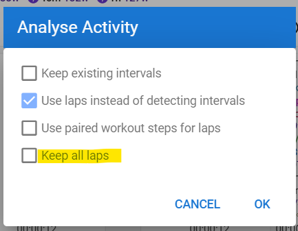 So you will need to do some basic manual editing. Depending on your habits, I would set ‘Keep All Laps’ checked and for higher intensity interval workouts, simply hover your mouse over the rest intervals and press D to change it to a Rest interval. That is if your higher intensity workouts are something like x * y min and where x isn’t a big number.