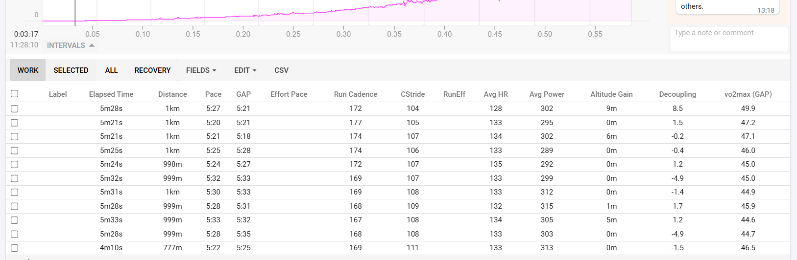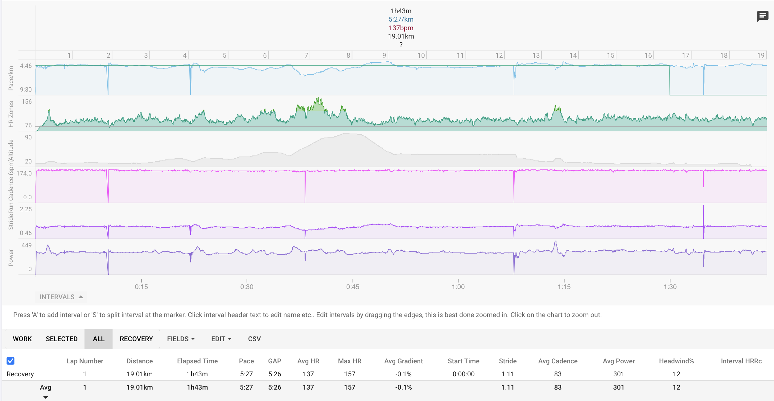 If on the other hand, you regularly do something like 30-20’s, I would toggle the default behaviour to get those correct. For your easy workouts then, click the header of the one big interval and choose Split, to quickly split it as you want (per km, per min…)