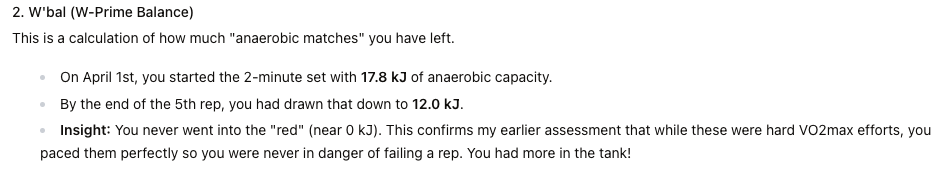 See the post above with examples, essentially LeCoach can now dig even further into your activities and study every single interval/step/lap of your ride or run to for example analyze power drift, hr drift, cadence but also W’bal (W-Prime Balance), decoupling, load per interval step and a lot more metrics. This helps LeCoach to better assess workout execution and how tough a workout really was for you (and thus if future workouts should be adjusted up or down).
