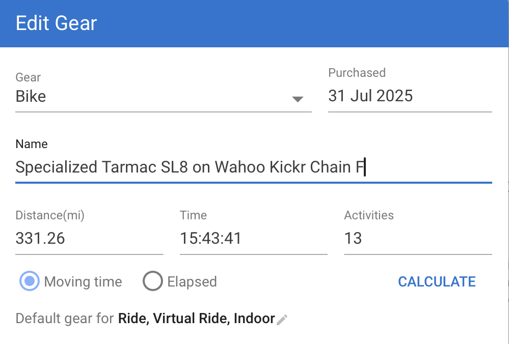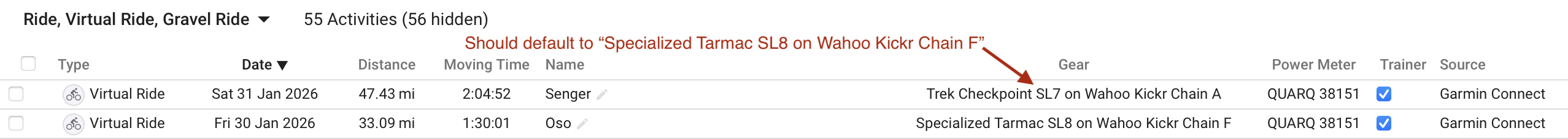 No matter how I define the filter on the Edit Gear page, the same bike is always assigned to my indoor rides. The bike that gets assigned to indoor rides happens to be the same bike that I had originally chosen on the settings page for indoor rides before the more flexible “Default gear for” filter feature was rolled out.