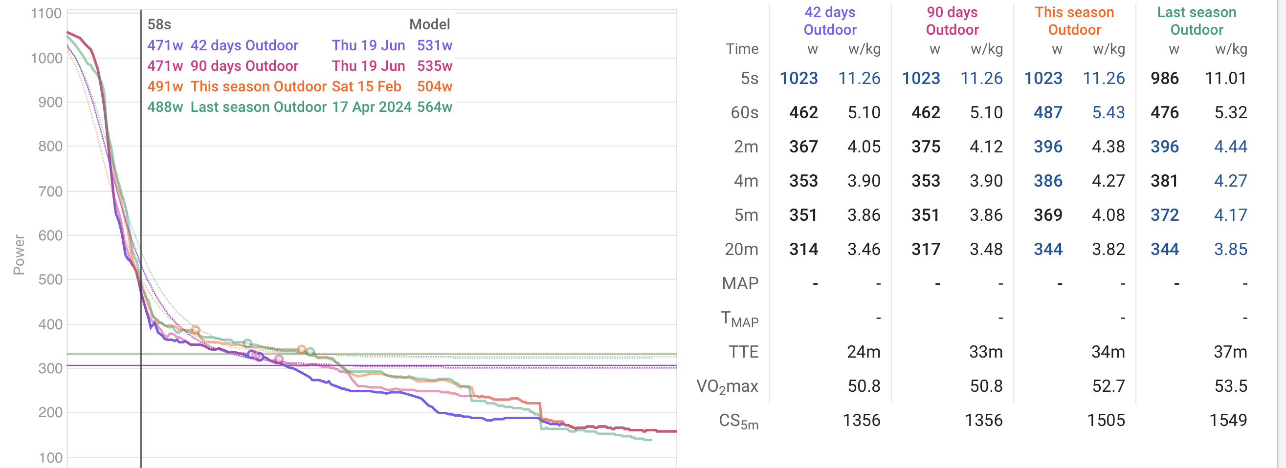 If I look at my power curve I can see that the model doesn’t really model well my expected power at 1m. I would expect the mmp to use my best power for the last 42d instead, which is much lower…