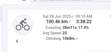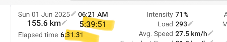 I did 100.6 km in 3:38 moving time. the average is then 27.7 km/h. the total elapsed time was 4h so 25km/h
