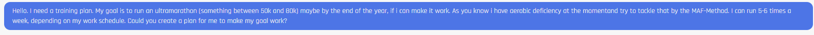 For example, there is no separate screen for “injuries.” You just tell the AI you have one, it remembers, and it adjusts your plan. This allowed me to simplify the UI significantly compared to other apps.