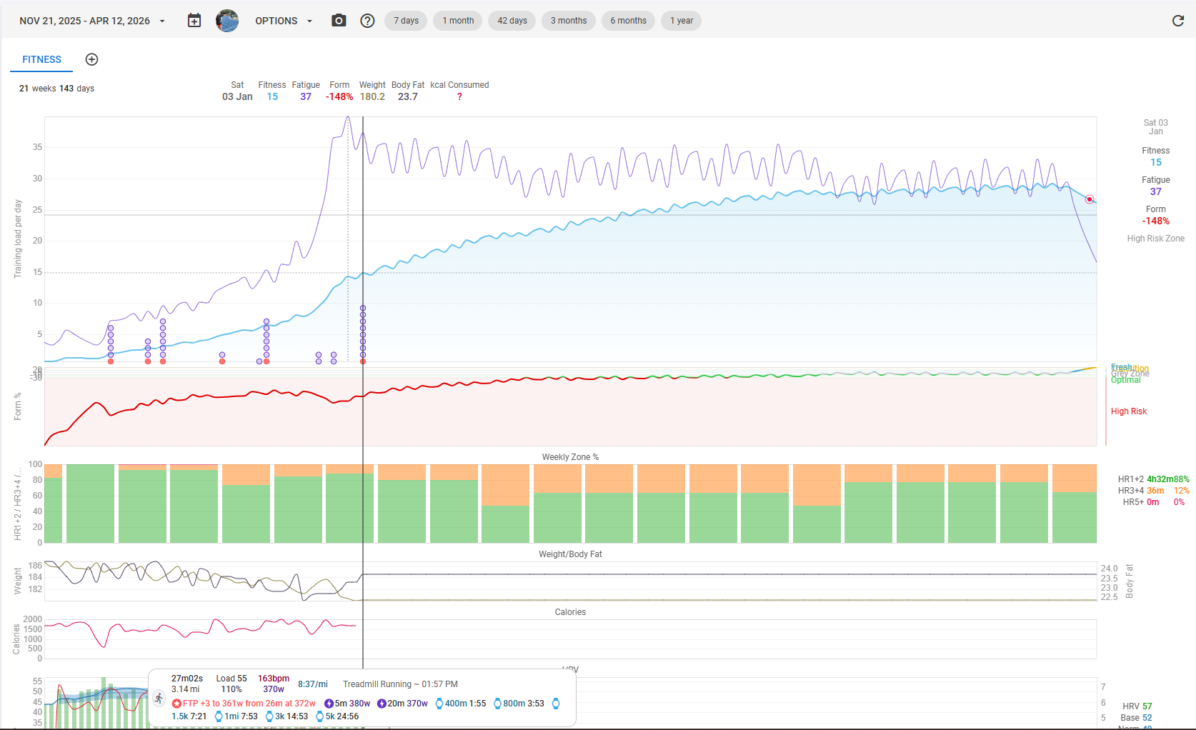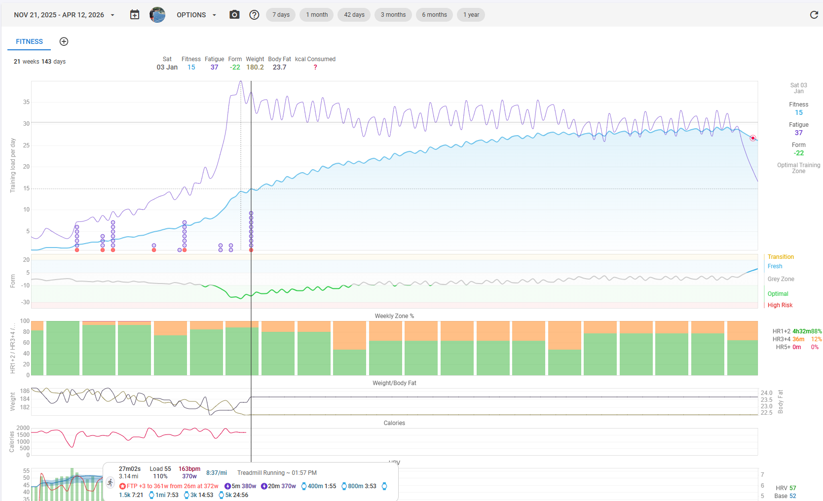 Ok, I’m going to start this off as I am fairly new to running. I’m been at this for about 6 weeks now, but I feel like I am in reasonable shape as a starting point (27m 5k). I have my first official timed 5k for April so I have been working on a training plan in here. My question though surrounds the “Form” on the Fitness page. Should I be looking at the Absolute value or the Percentage of Fitness value? They show up very different as you can see from the screenshots below, I assume this is partially due to lack of historical data. Based on what I have read, I should try to keep Form in the Optimal range to improve my fitness level and ultimately better my 5k time. Unrelated, how high should I expect my fitness number to get after 5-6 months of training (I’m sure that is somewhat person specific).