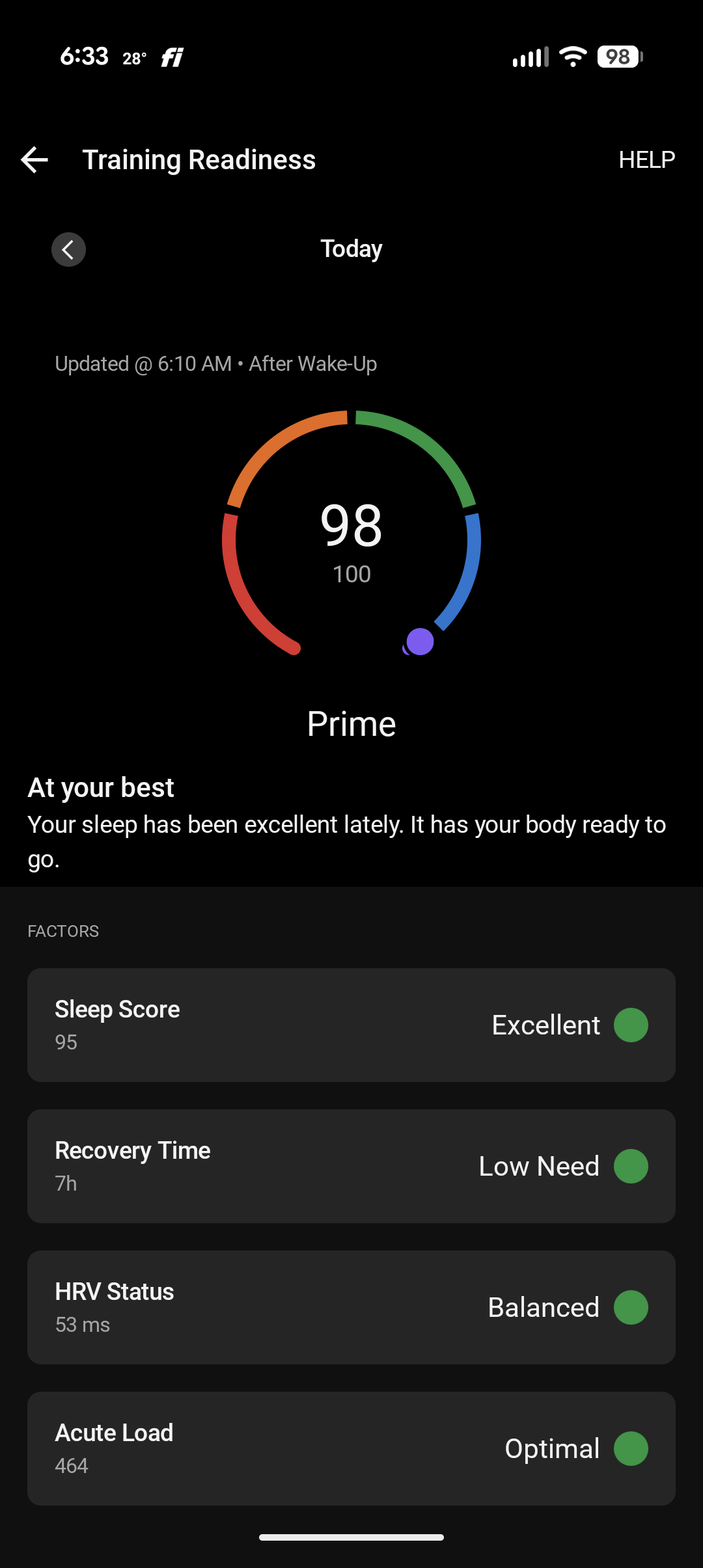 I would say overall I feel very good. Many days on easy runs, even after going 6+ miles I feel like I could do more. I almost always feel very recovered within 24 hours. My Garmin regularly has my training readiness very high the next Morning like today (after running a 27m 5k last night). No major aches and pains. Obviously my calfs some day do feel like they put in some work, but nothing crazy. I often feel like I could do an easy run on my rest days. Currently trying for 4-5 workout days per week, which feels easy.