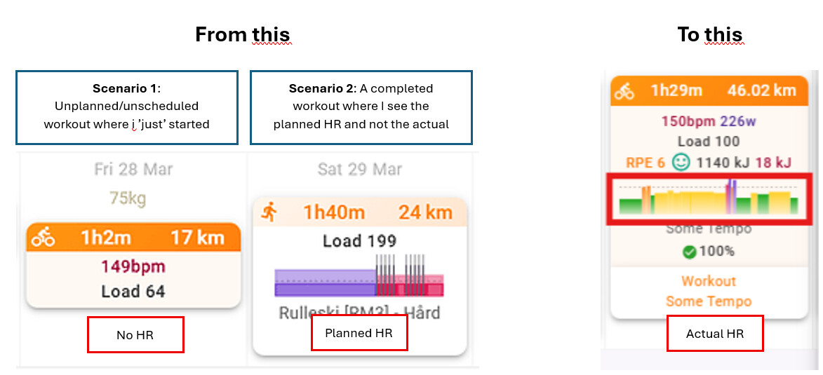 I’ve tried to explain it with a few combined screenshots. Ultimately, I would like to see the actual HR that you see in your plan and not the scheduled workout HR I see in mine.