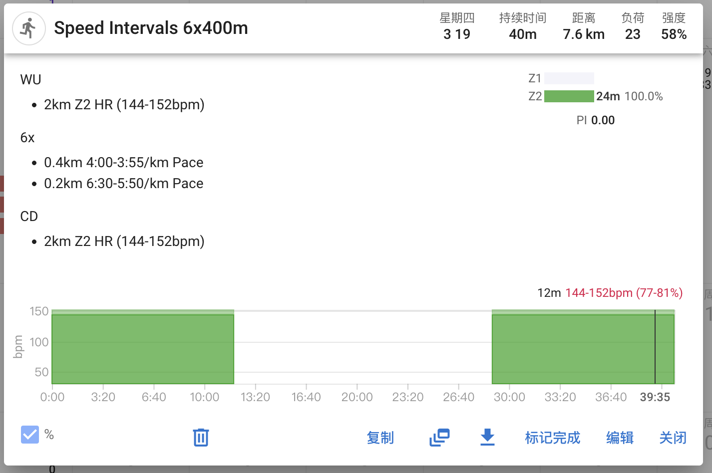 - 2km Z2 HR (144-152bpm)
