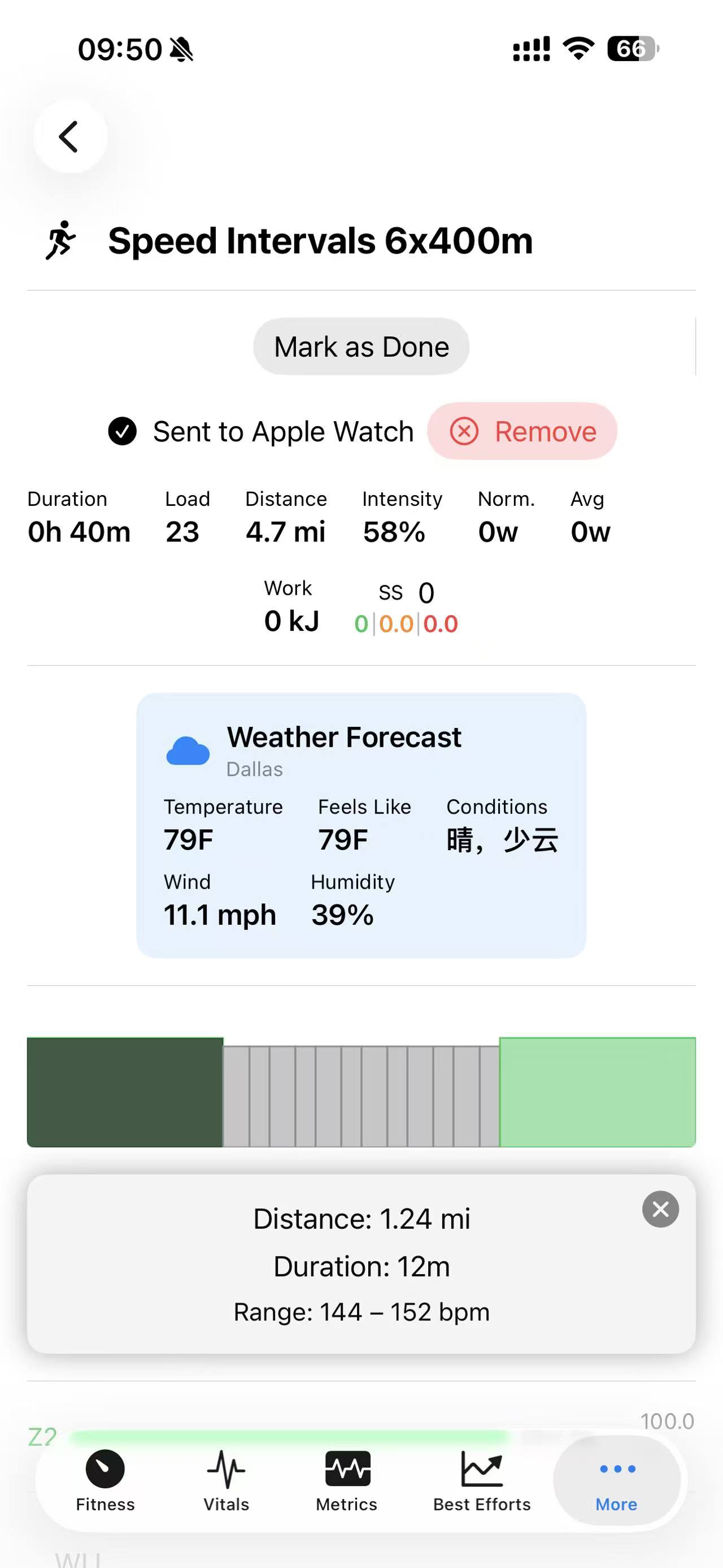 HR targets (Z2 / 144-152bpm) show up correctly on Apple Watch