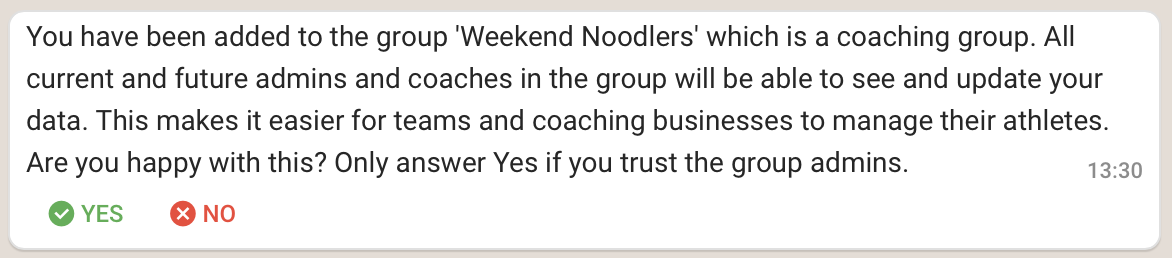 If they answer yes then all the group admins and coaches are granted coach access. The member receives a chat message from each coach: