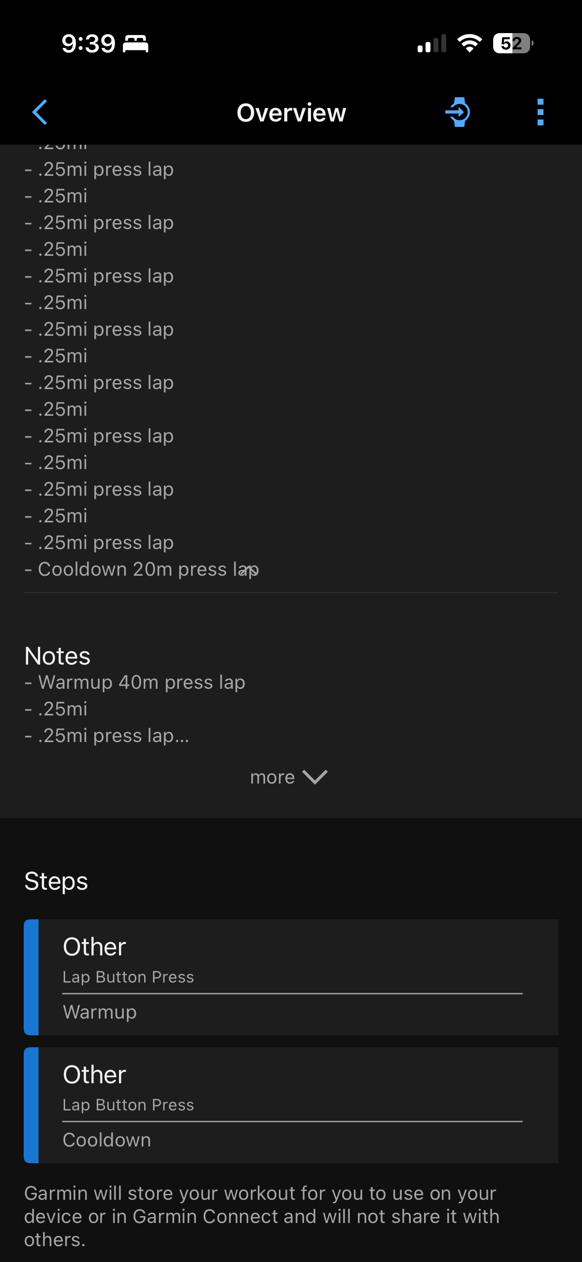 but when I attempted to do the workout on my watch, it did not work. Looking at the workout details in the Garmin connect app showed the notes properly, but only warmup and warmdown intervals without even their time targets.