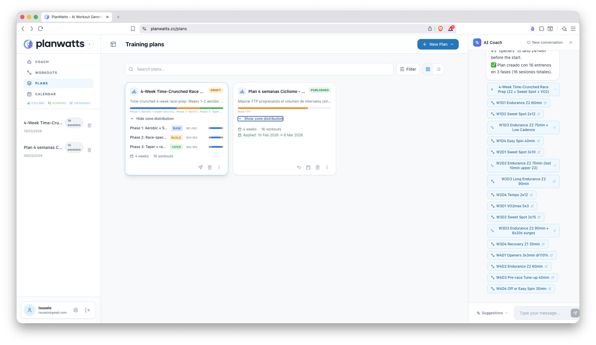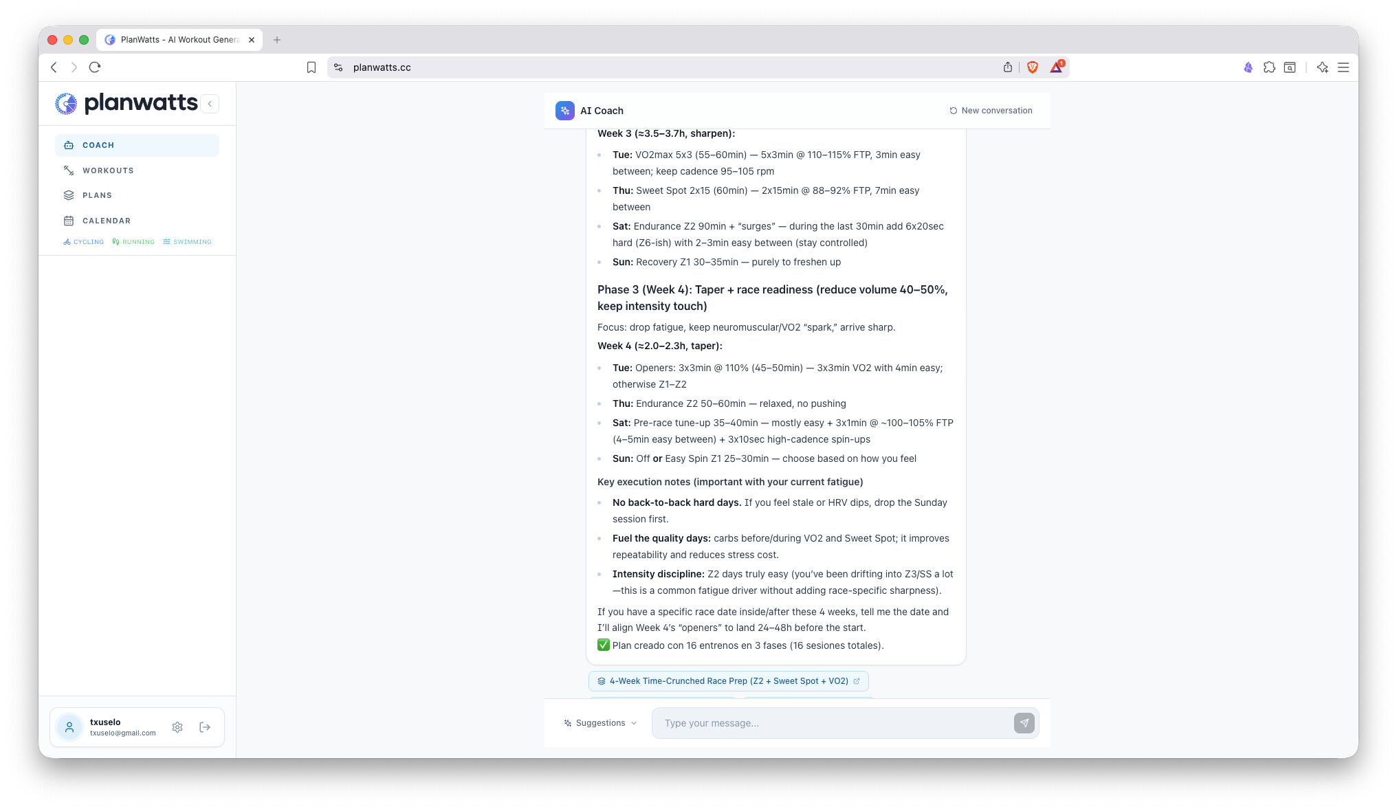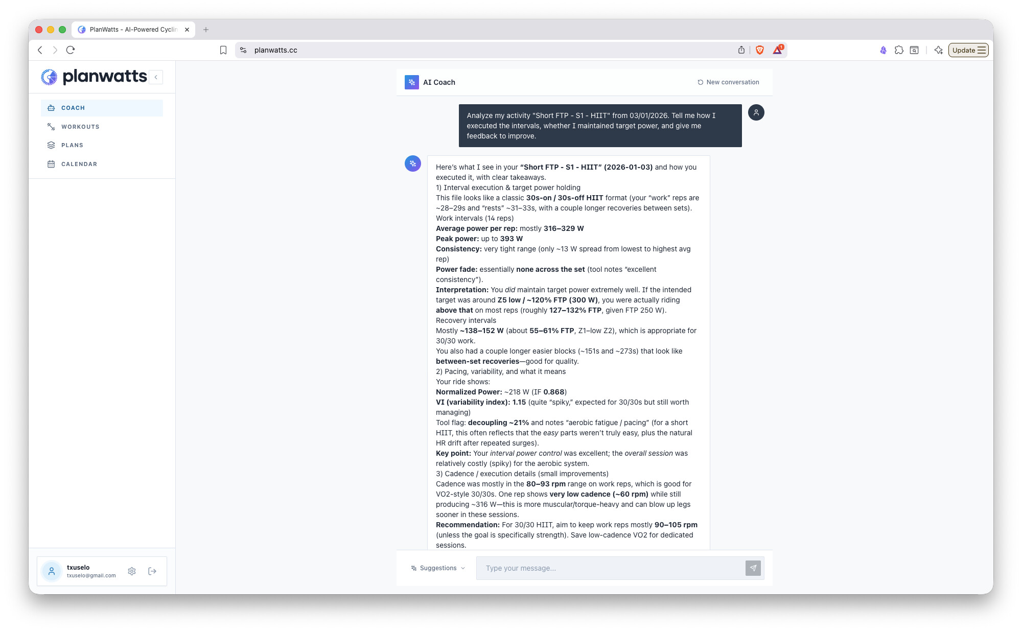 The biggest update yet. PlanWatts can now build entire training plans through conversation with the AI Coach, and it remembers everything about you between sessions - your PRs, thresholds, preferences, injuries, and goals.