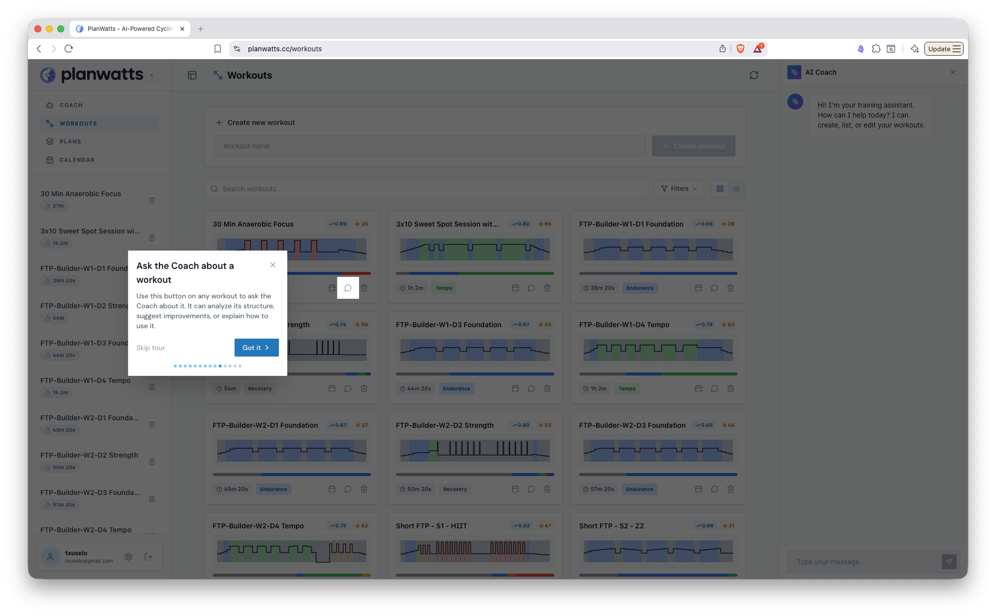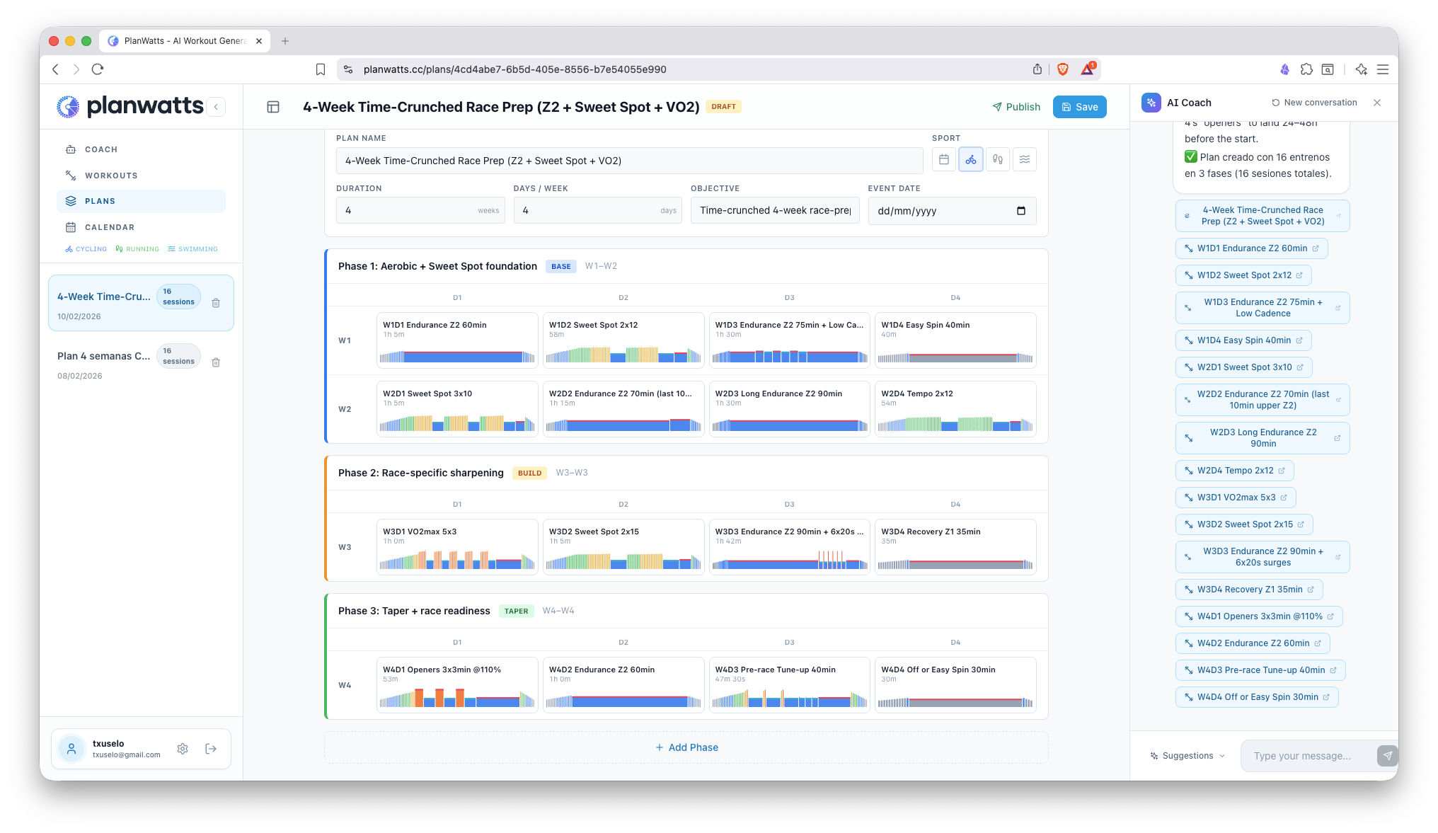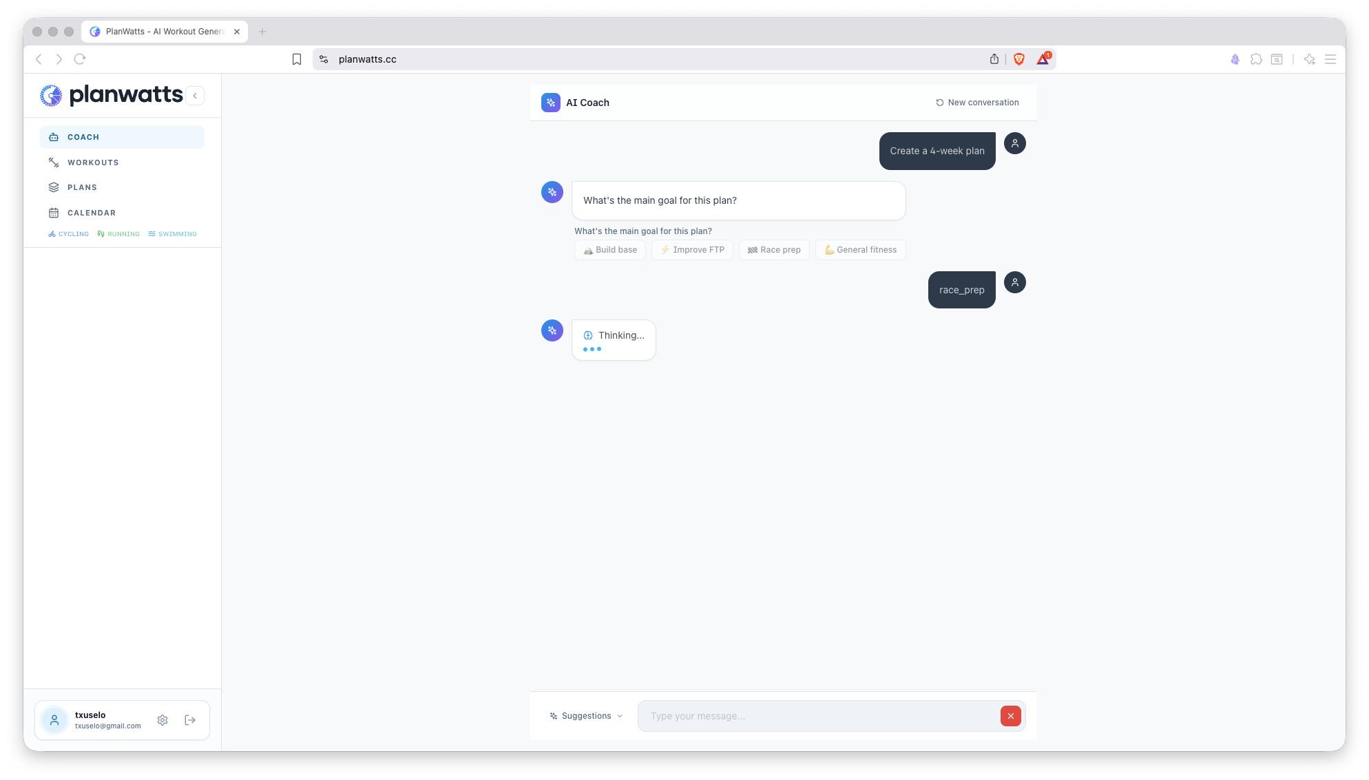 The biggest update yet. PlanWatts can now build entire training plans through conversation with the AI Coach, and it remembers everything about you between sessions - your PRs, thresholds, preferences, injuries, and goals.