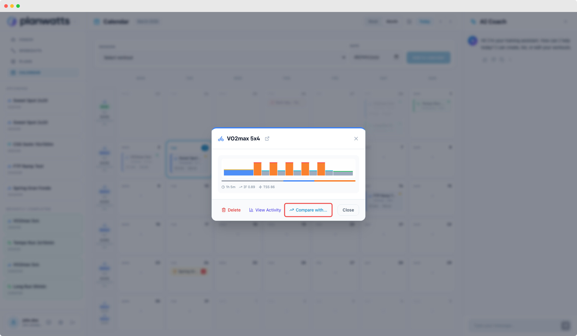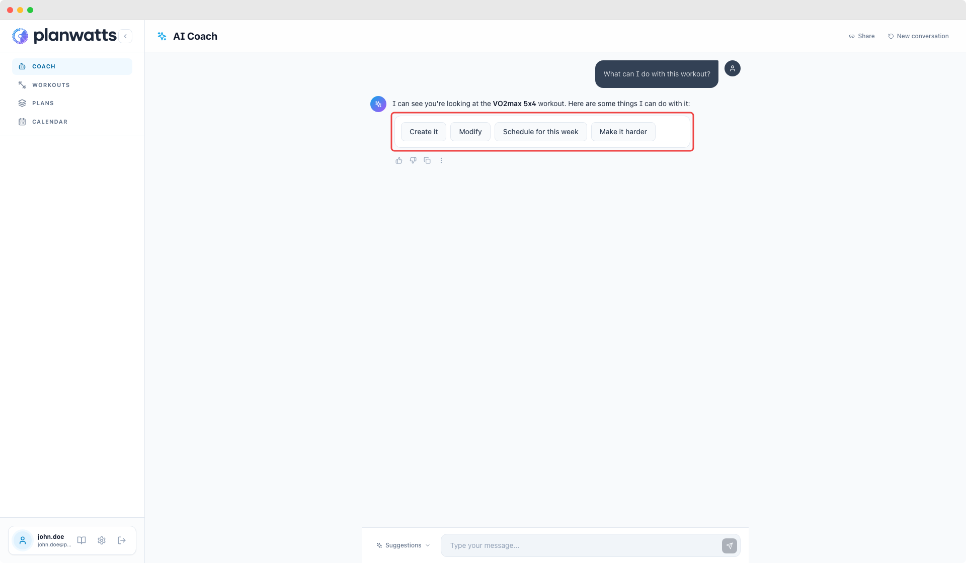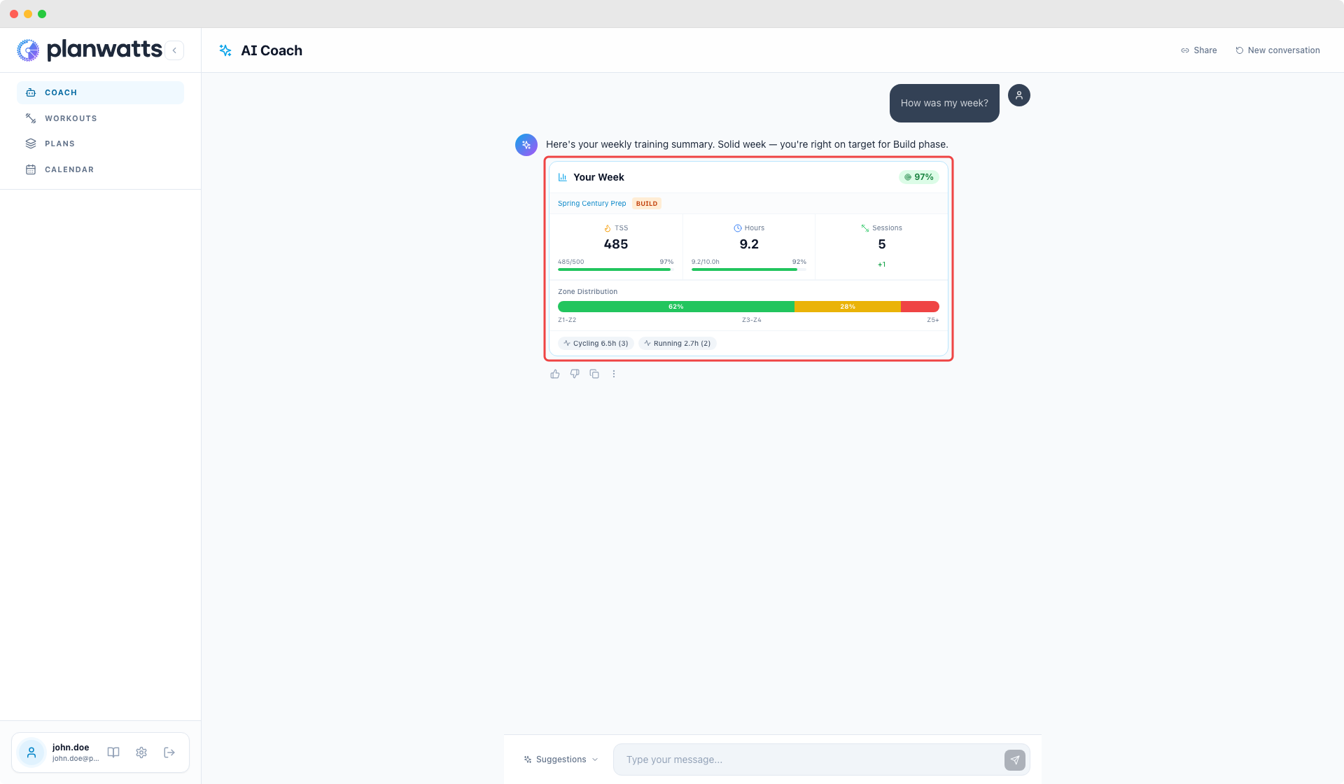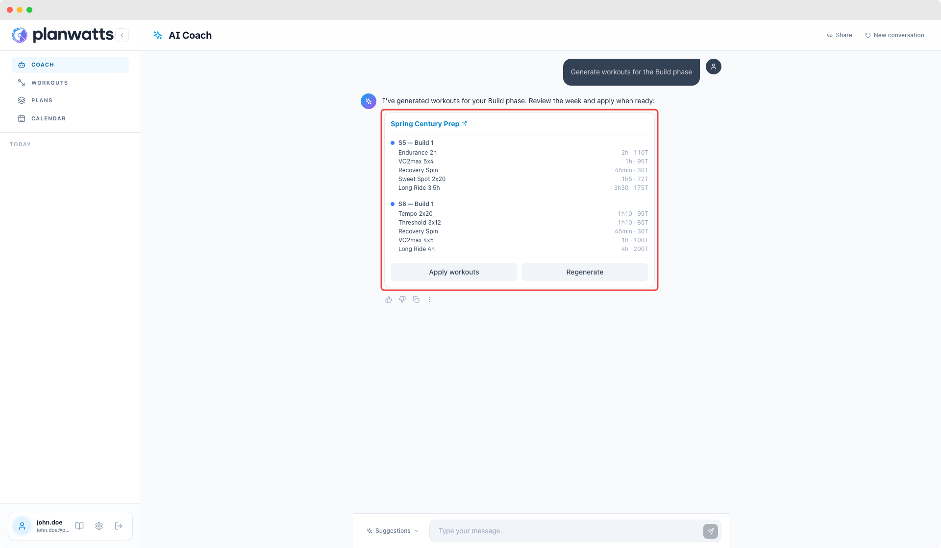 The coach knows your phase. If you’re in Base, it generates Z2 rides. In Build, it shifts to threshold and VO2max work