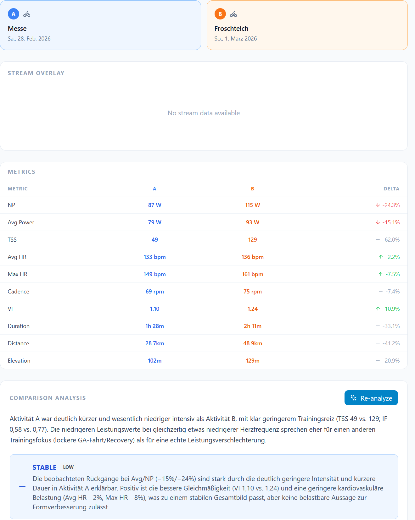 HR zones wrong in analysis — Also reported by Rui. The analysis was using generic zones instead of your personal ones from Intervals.icu. Now uses your actual zones