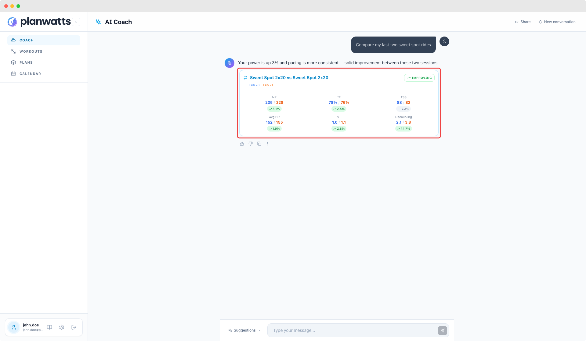 PlanWatts now has a docs section accessible from the sidebar or at planwatts.cc/docs. Covers getting connected, training plans, the AI coach, workouts, calendar, activity analysis, and settings. Available in all 6 languages.