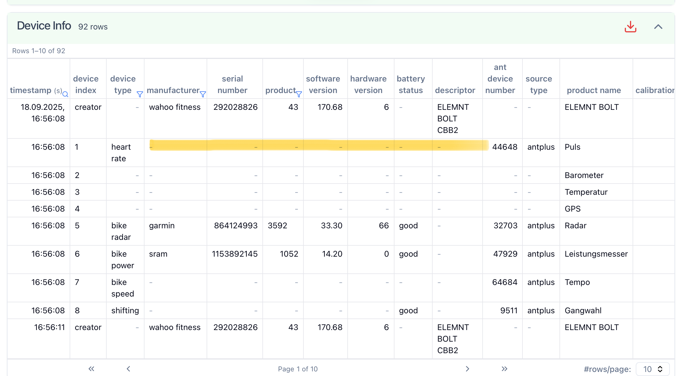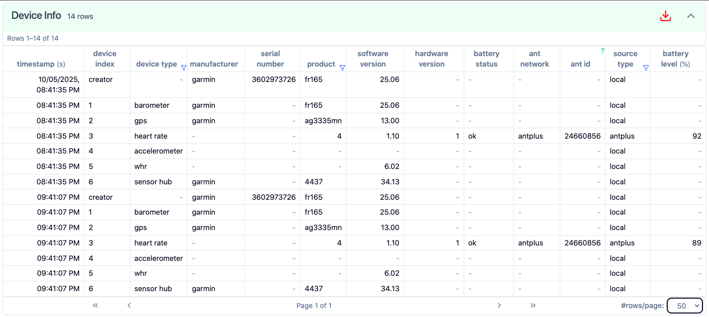 Note: I would presume that there’s 2 entries for each device cos It looks like one is start of workout and 1 at end of workout and the one with end of workout only thing I see different is the Battery_status and some other “field_x” which I’ve no idea what.