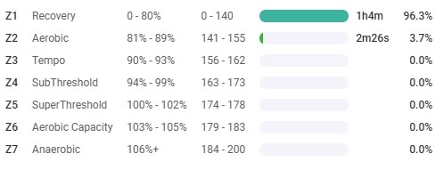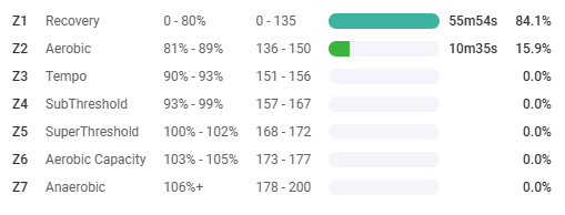 I’ll try out those Coggan zones you mentioned, thank you! At first glance it does seem a bit low (tempo begins at 145, vs. 150-156 in my current zones) but might be worth using as a starting point and putting my finger on the scale a bit.