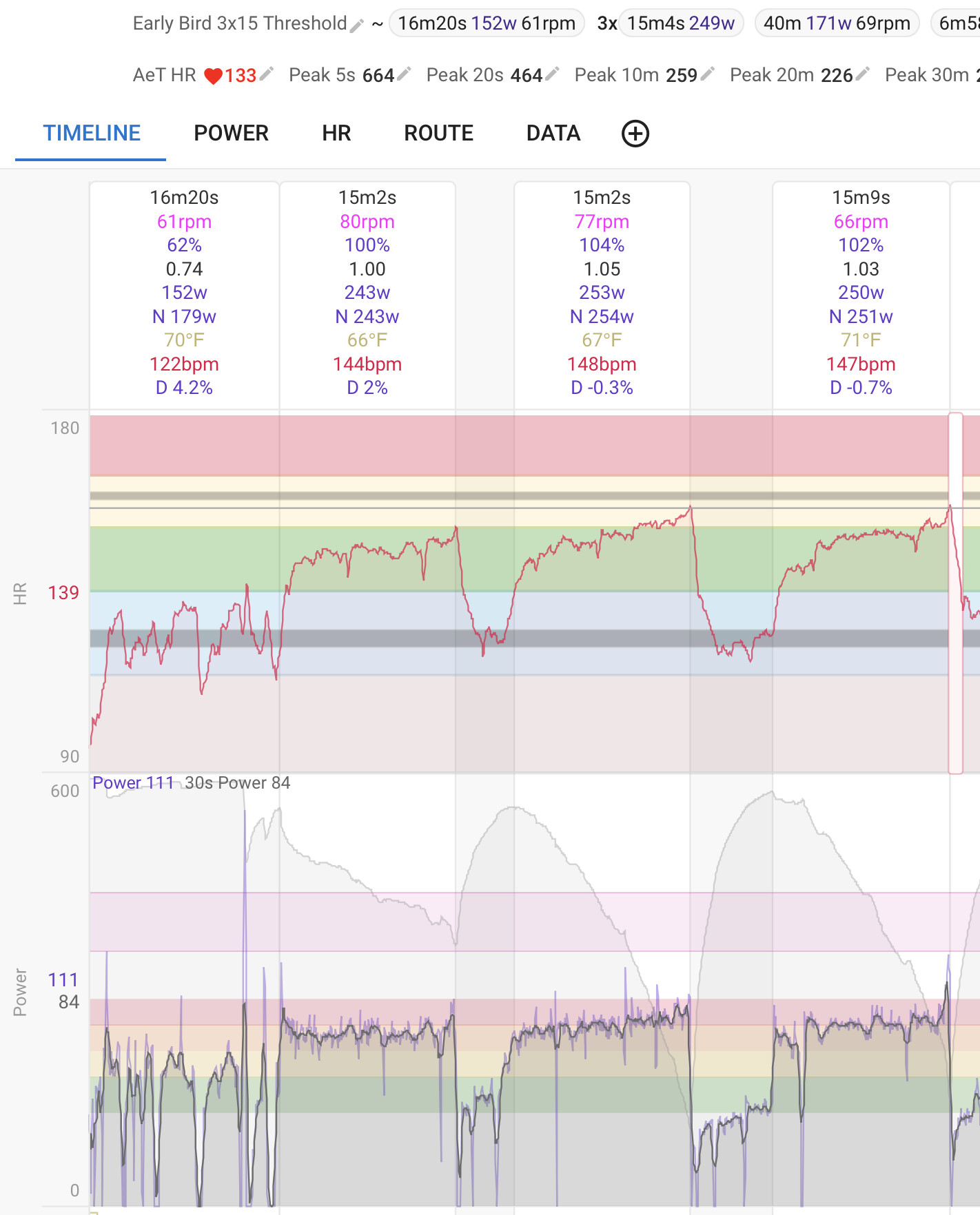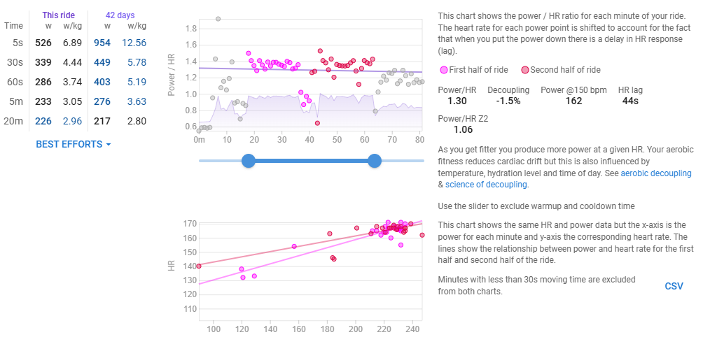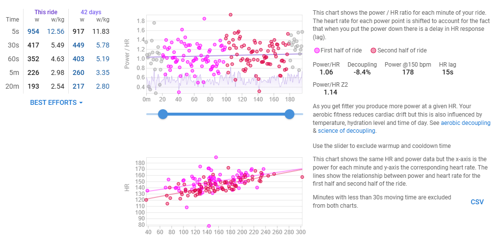 @fallingcow the first 15m 2s interval has D 2% just below 144bpm. Decoupling for the first one is 2%. The second interval has -0.3% decoupling, and the third interval has -0.7% decoupling.