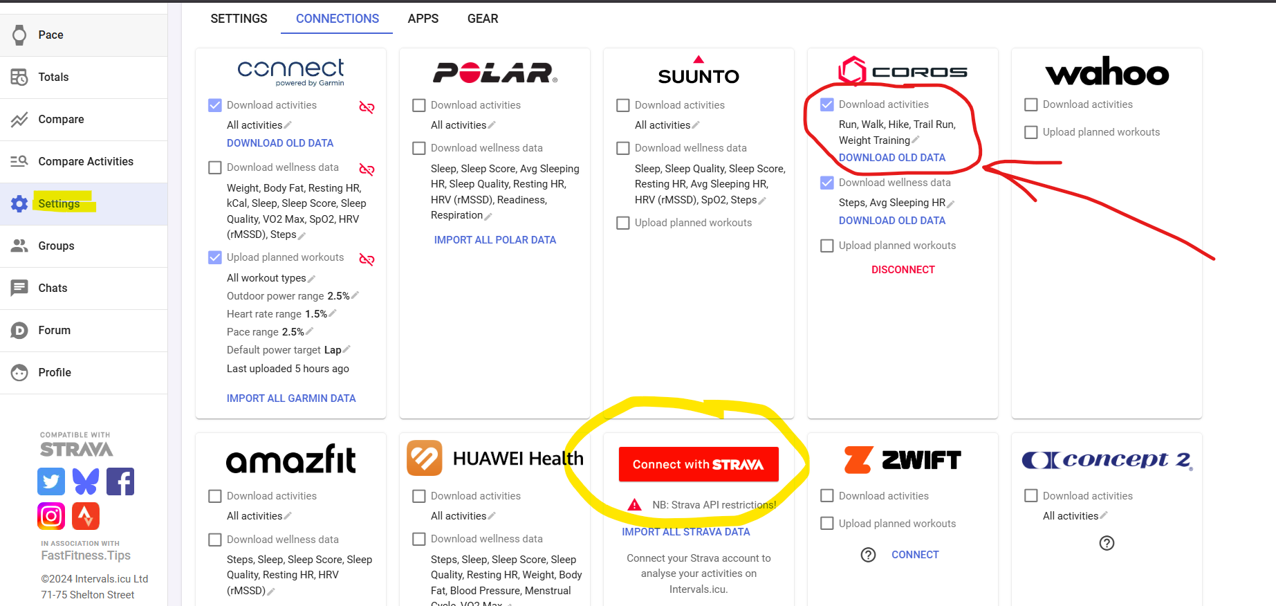 Look for a checkbox like indicated with red arrow and circle on the Strava connection settings.