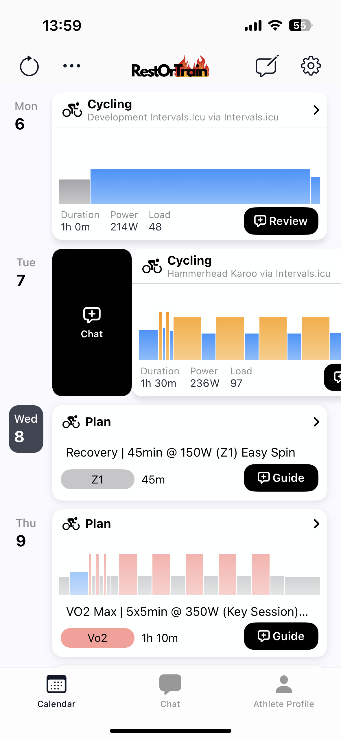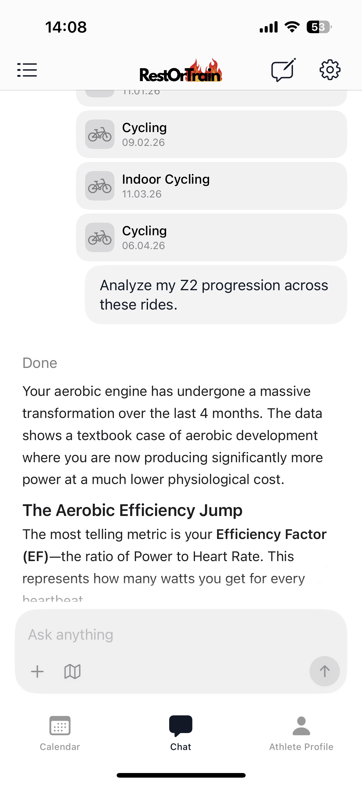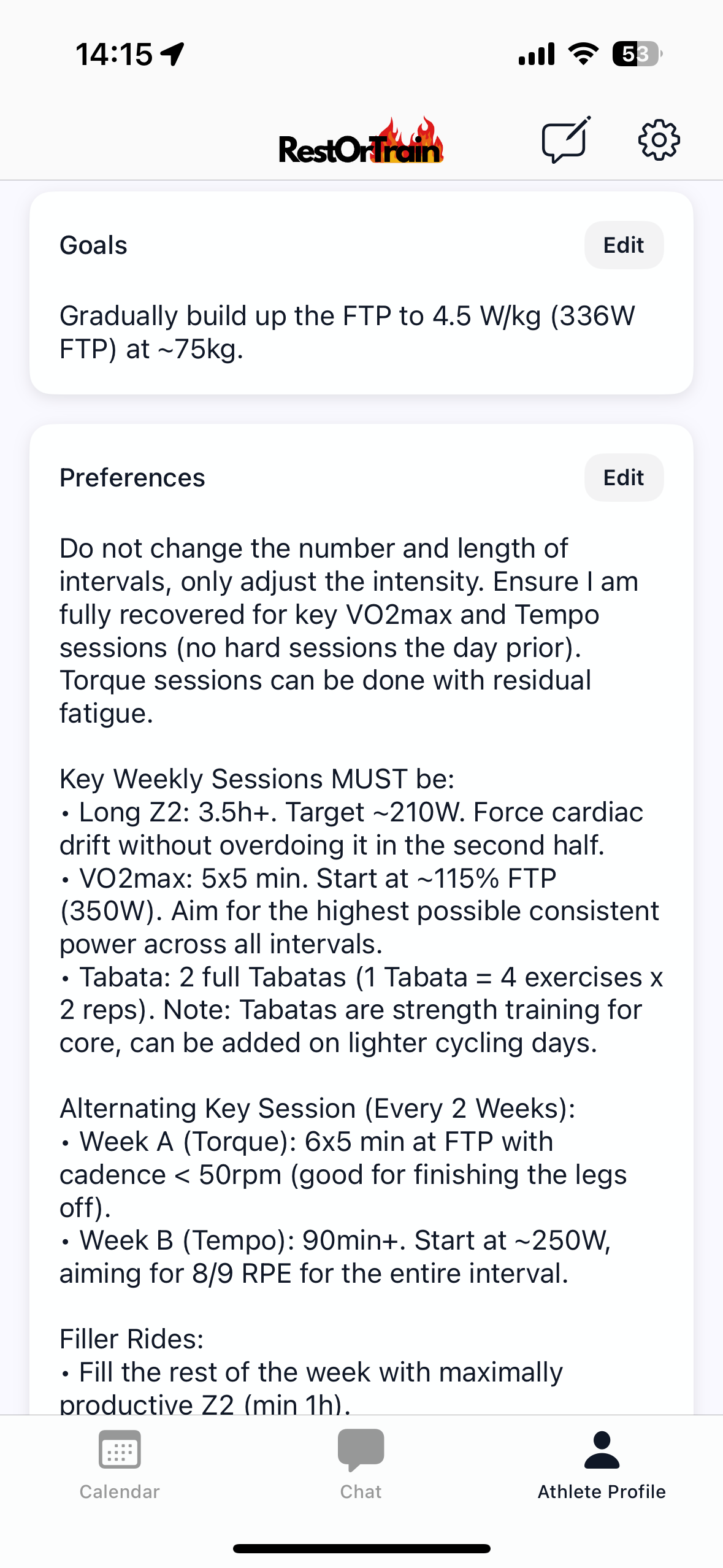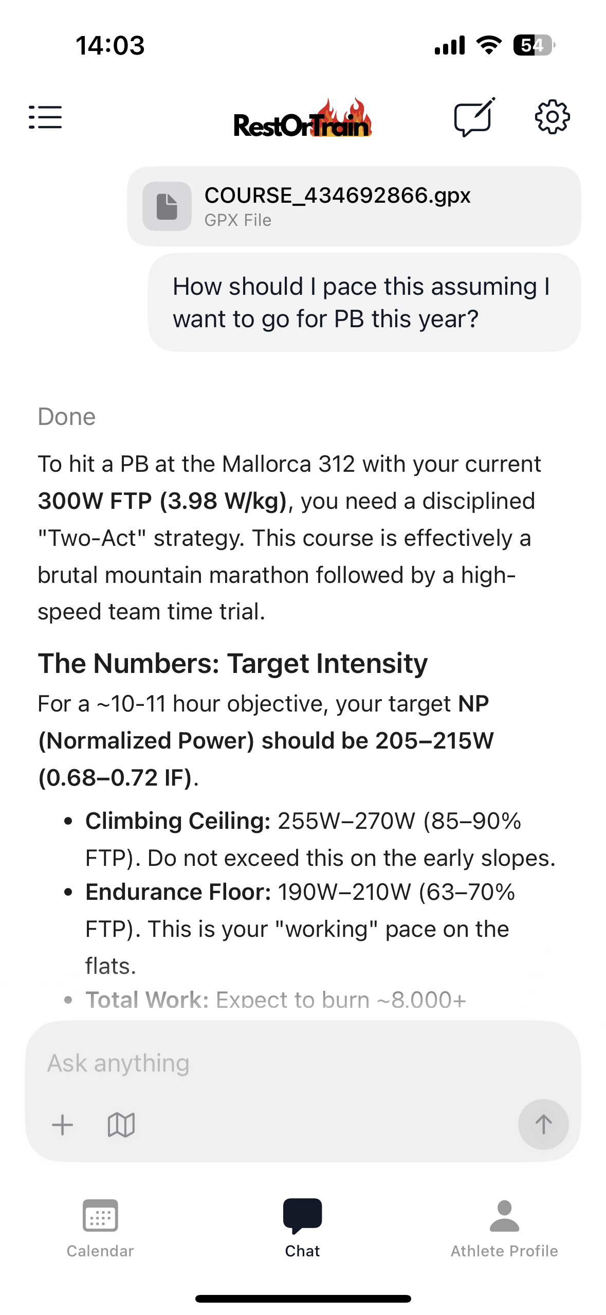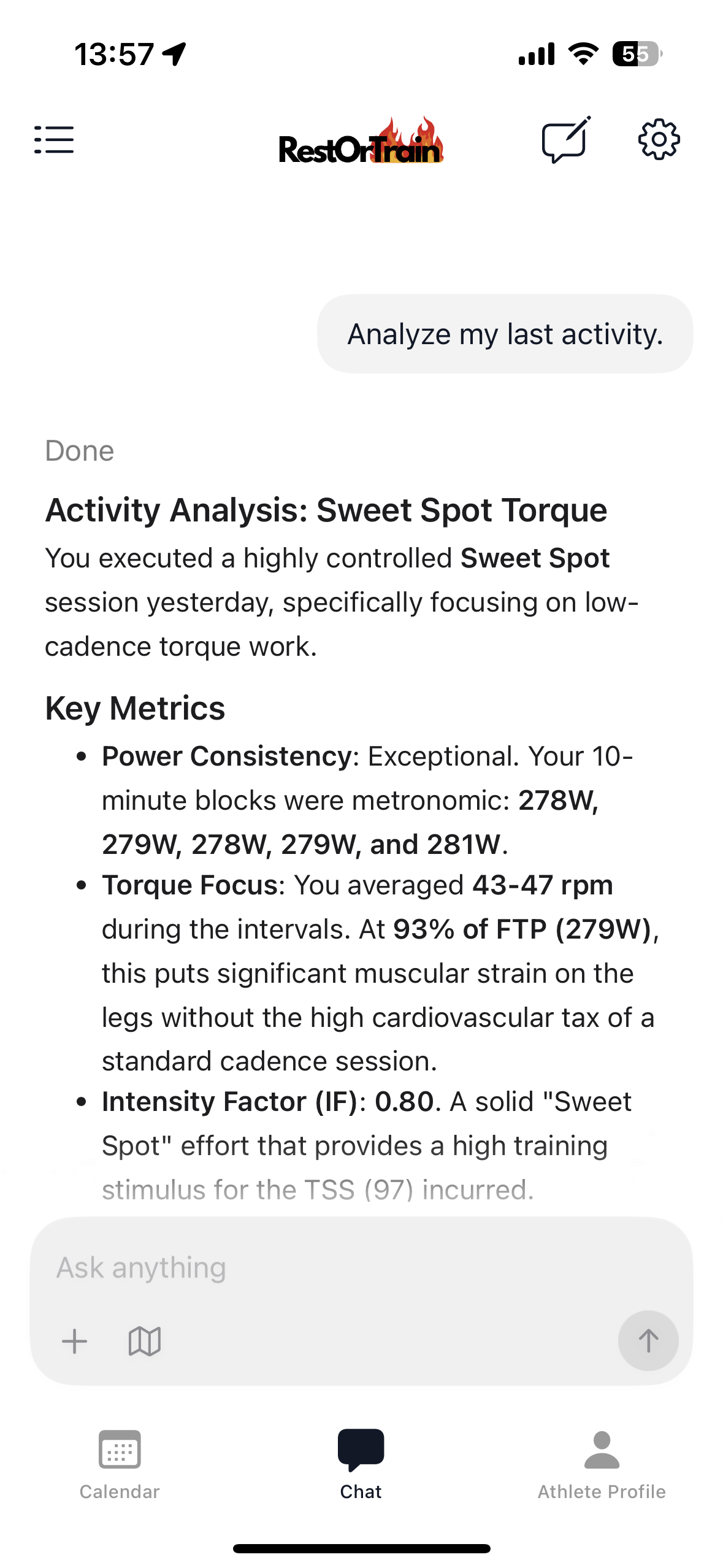 I’m Antoni, one of three people building RestOrTrain. I’m a cyclist, a long-time Intervals.icu user, and an ex-Google Software Engineer. I’m super excited to share that we just integrated Intervals.icu with RestOrTrain - an AI tool to analyze and plan your training. Basically, it’s an AI chat interface with cycling-specific “steroids” (and there are quite a lot of them…).