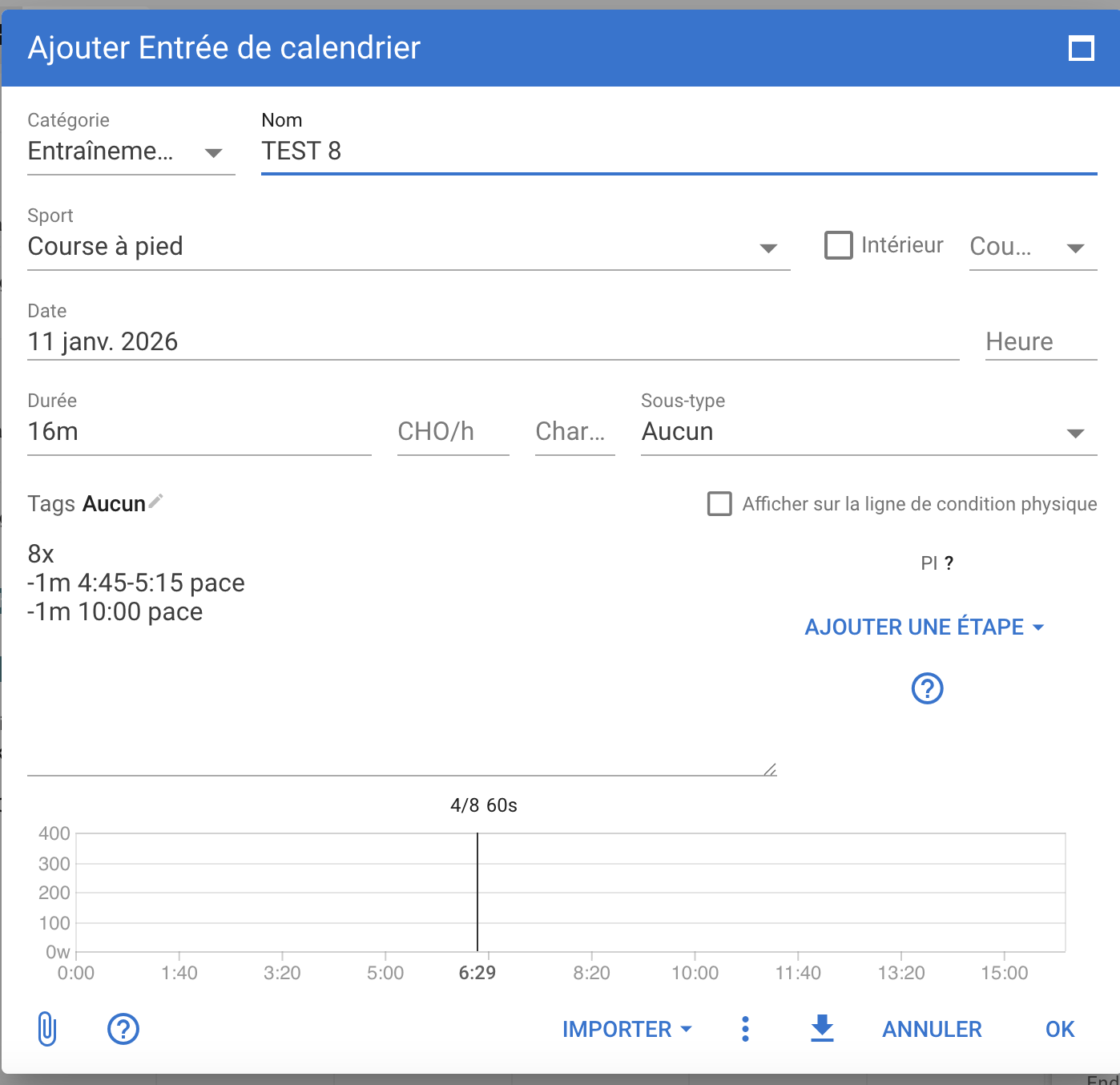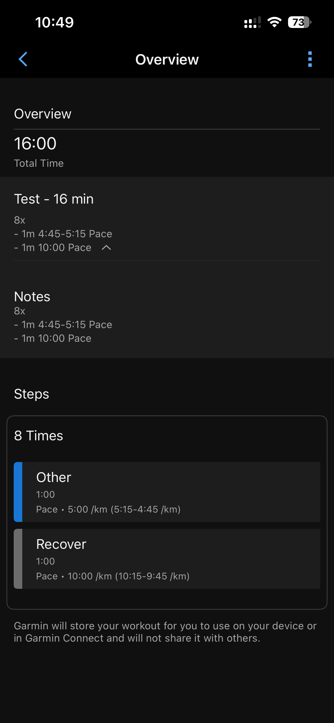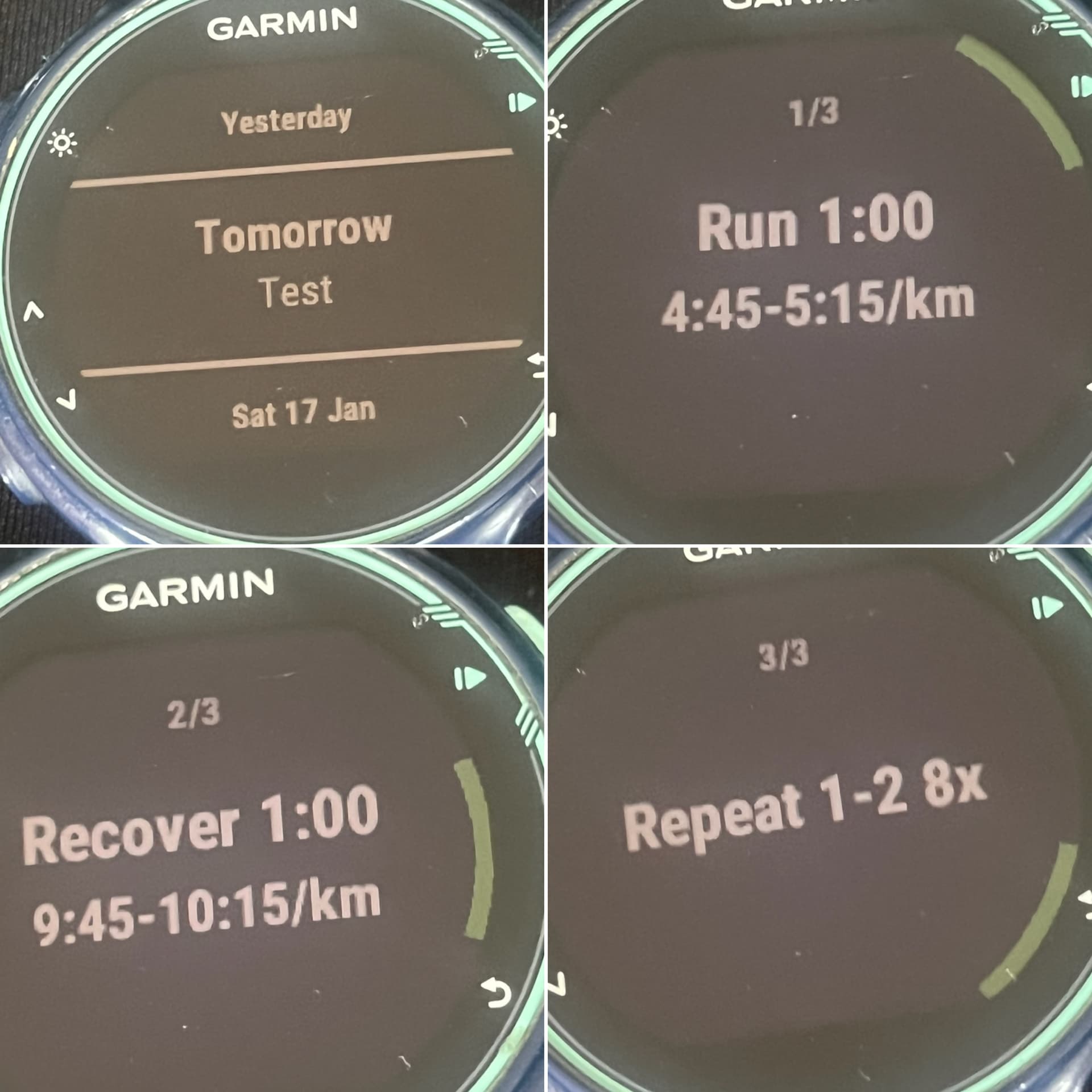 That’s it for my simple interval session. I record the warmup and cooldown just using the run function on my watch as separate sessions. It upload to the calendar and the workout syncs to my garmin connect calendar and watch. However the pace doesn’t show up in either the garmin connect calendar or when I want to do the workout using my forerunner 235.
