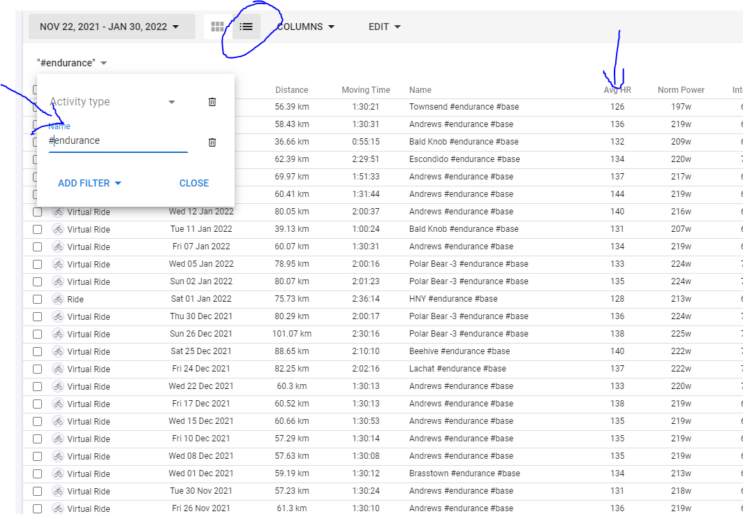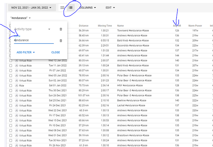 Alternative approach I use a lot - show Activities as a list, filter by name and make sure Avg HR column is visible…