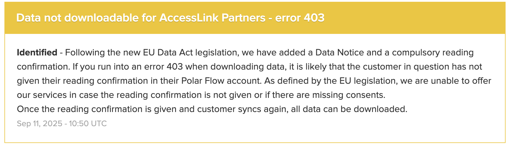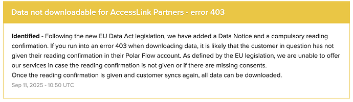 I did not get that error message until I deleted the connection from Polar I think the issue was that Intervals was downloading my data but just not showing it to me as the default date range was wrong so I was struggling with the wrong issue and it took a few days to figure it out.