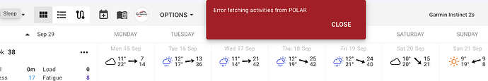 Also tried to reset the connection in settings yet the error is persistent, not sure what is causing it but the Polar API seems unreachable.