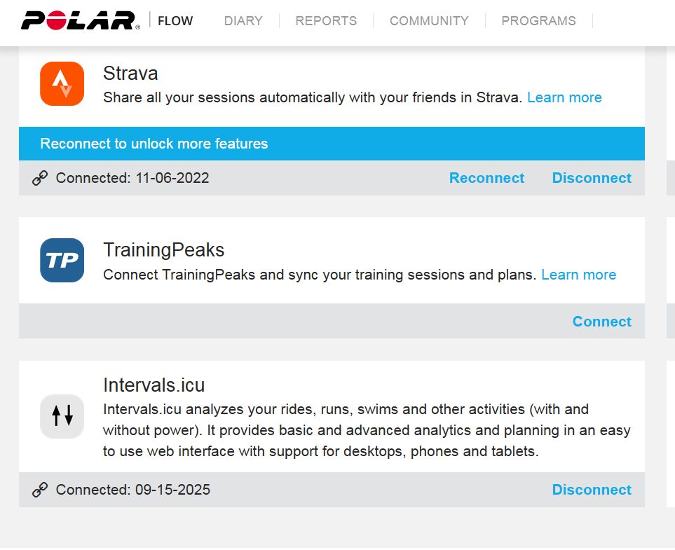 How did you “Disconnect Polar in the intervals settings”? I think I’m in a similar situation (no “reconnect” button in the Polar settings for intervals.icu), but on the intervals.icu I don’t have a disconnect option.