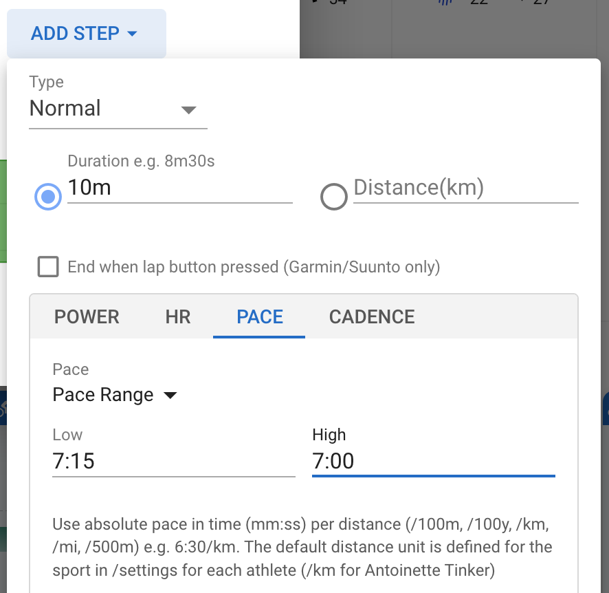 “Pace” and “Pace Range” have been added to the “Add Step” form: