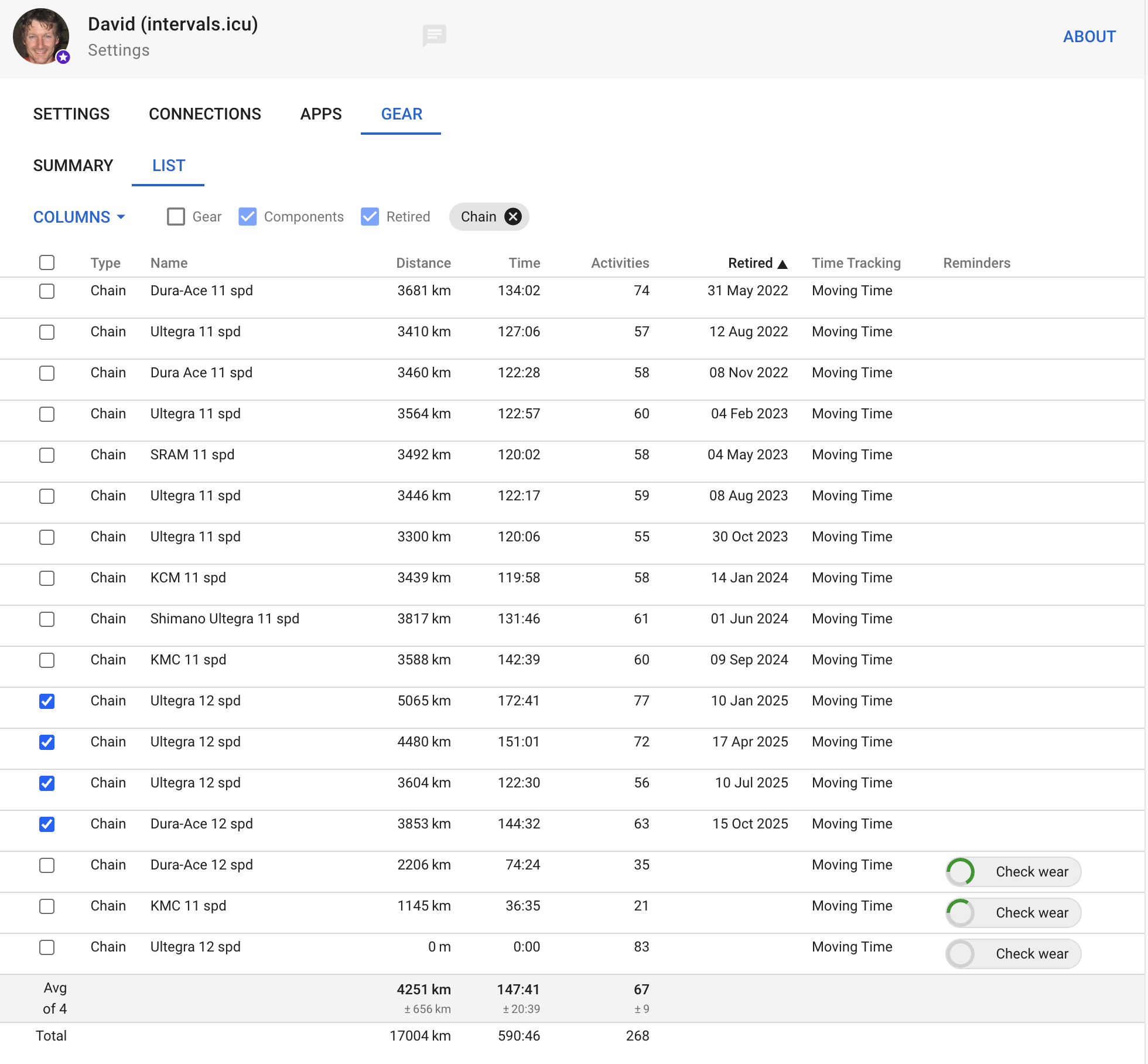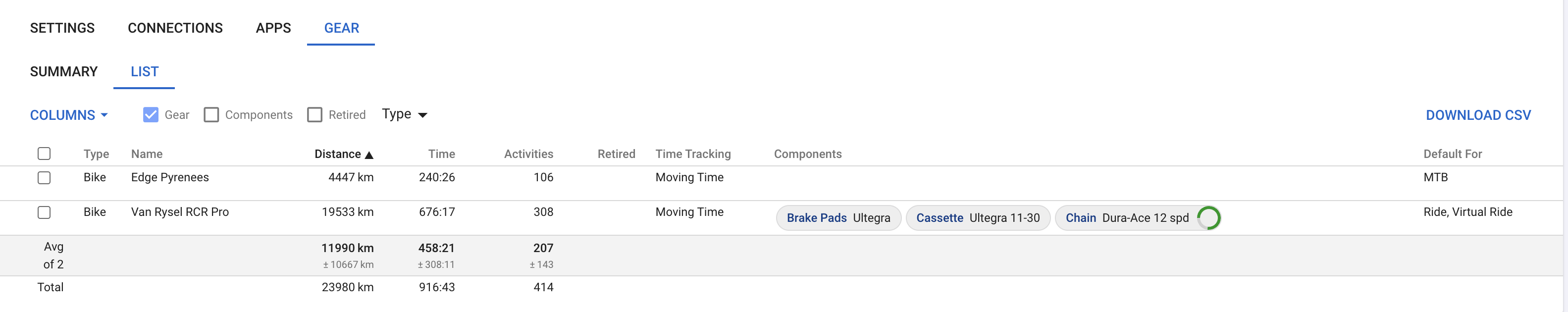 I am loving gear tracking on intervals.icu and have switched to using it instead of strava, however I find the gear section in the settings a bit difficult to navigate - it would be immensely helpful if it was presented in a way similar to the activity list view, where I can also order by mileage/time/number of activities/most recently used, or even filter (bike/shoe etc).