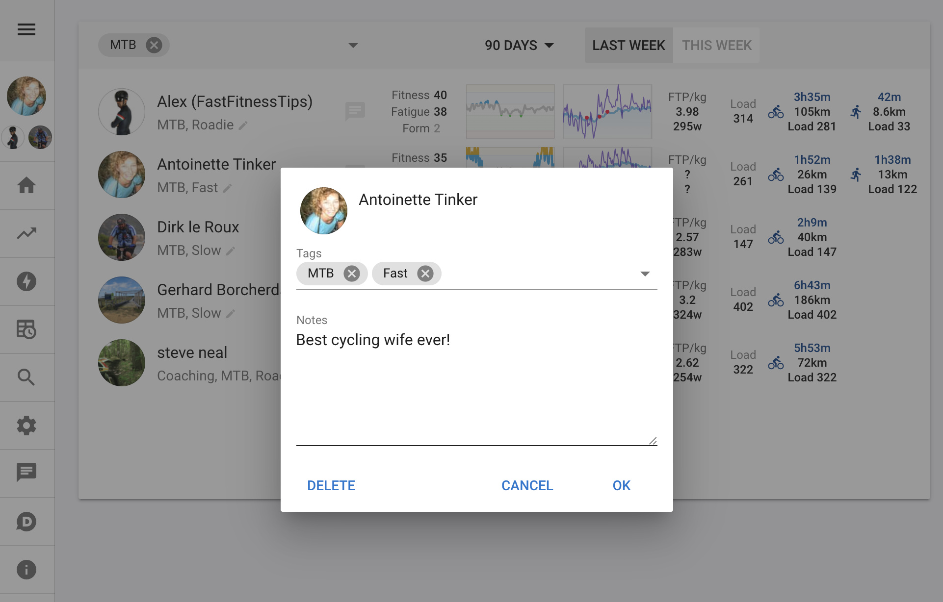 You can now add tags and notes to the athletes you follow and filter by the tags on the athletes page. Athletes you coach automatically get the “Coaching” tag. If you remove that tag then you will no longer be coaching them. The little navigation buttons on the left menu cycle through whichever athletes are selected on the athletes page.