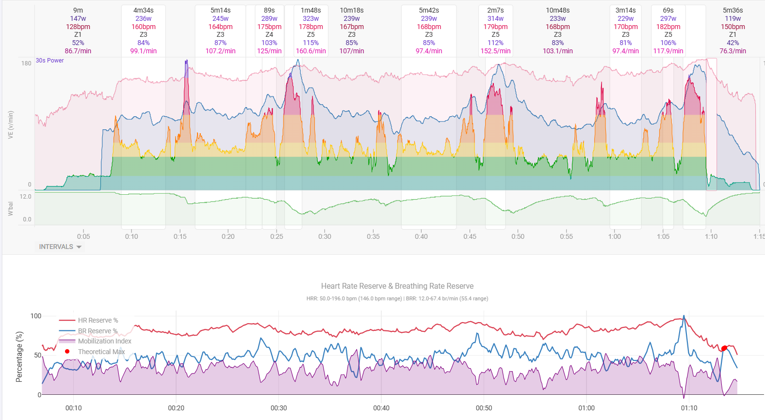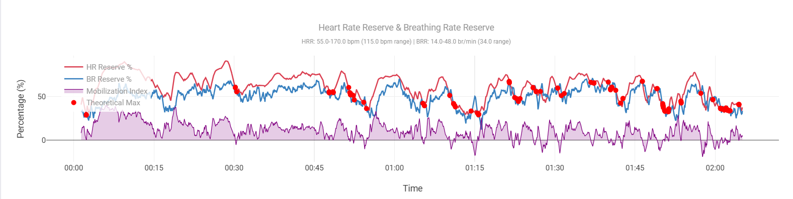 I’ve introduced this metric. We just call it the mobilization index. And all it is, is the percentage of the breathing rate reserve that’s being used at any given moment divided by the percentage of the heart rate reserve. And initially that may be 50% and then it ends up being 100%, or a ratio of one. And when you get close to one, you’re cooked. It shows that you’re cooked often at a heart rate that’s not indicative of being cooked. Your heartrate is not at max. You’re at 90% or you’re at 87% but your breathing frequency is so high, relative to heartrate, that it tells us this person is glycogen depleted, fatigued, doing everything they can to achieve that oxygen consumption and even though it looks like they should have more to give, they don’t have more to give.