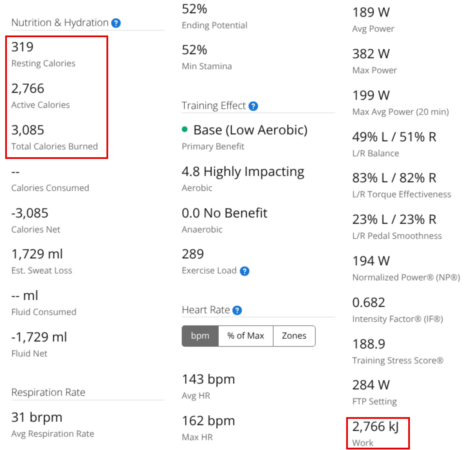 319 here precisely reflects my resting calories times 4 hours. The kj to kcal approximation for the work done is the active calories, 2766. And Garmin reports the total of 3085 to intervals. If you record 2766kJ of work on Zwift however, it will report total calories without any “resting”, i.e. closer to 2788.