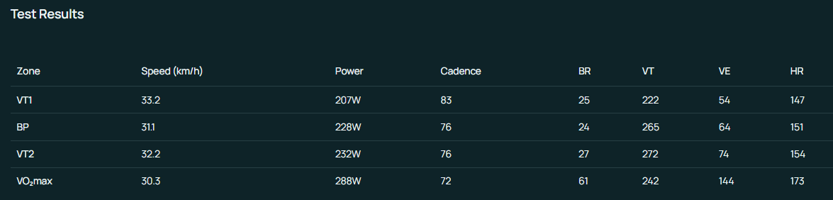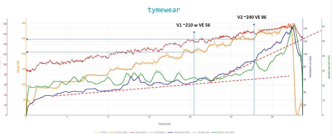 Zone 2 calculated from Tymewear ventilation and power data (VE 46 / Power 170 W) was slightly lower than Zone 2 derived from lactate data (185w). This was confirmed in subsequent training sessions.