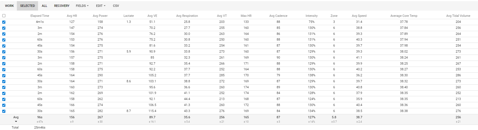 Power was in Z6 during the intervals, while heart rate and ventilation were in Z5. Lactate and ventilation helped me see that this interval duration and intensity are too high for my current goal (it is “too much”).