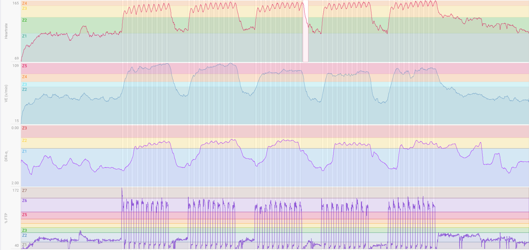 If you look at this you see that power cycles between Z6 and Z1/2, RPE is really hard at the end, HR and HRV never got into top zone (Z5 for HR and Z3 for DFA a1), whereas VE goes into Z5 (VO2max) for most of the HIIT sets… is this good enough for VO2max training?