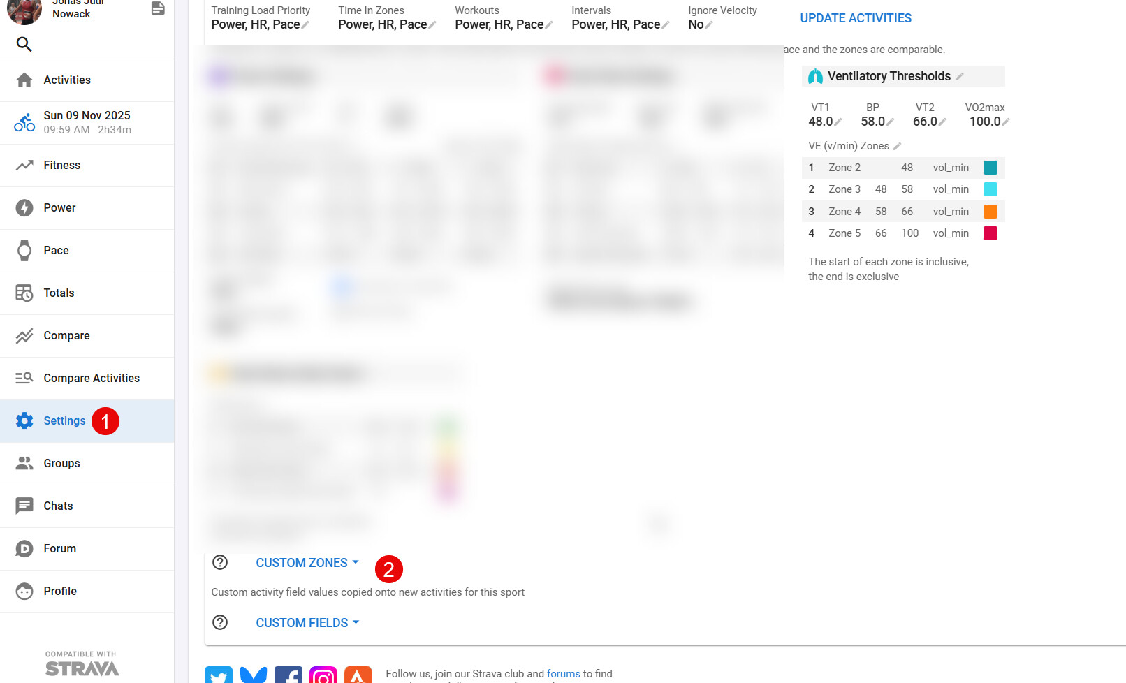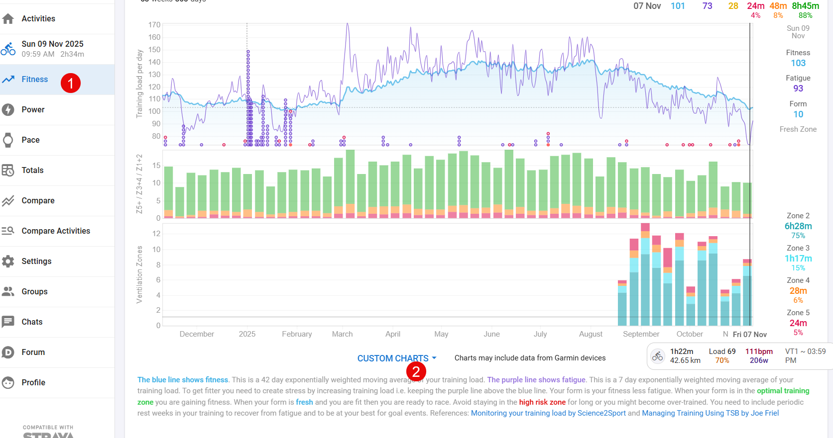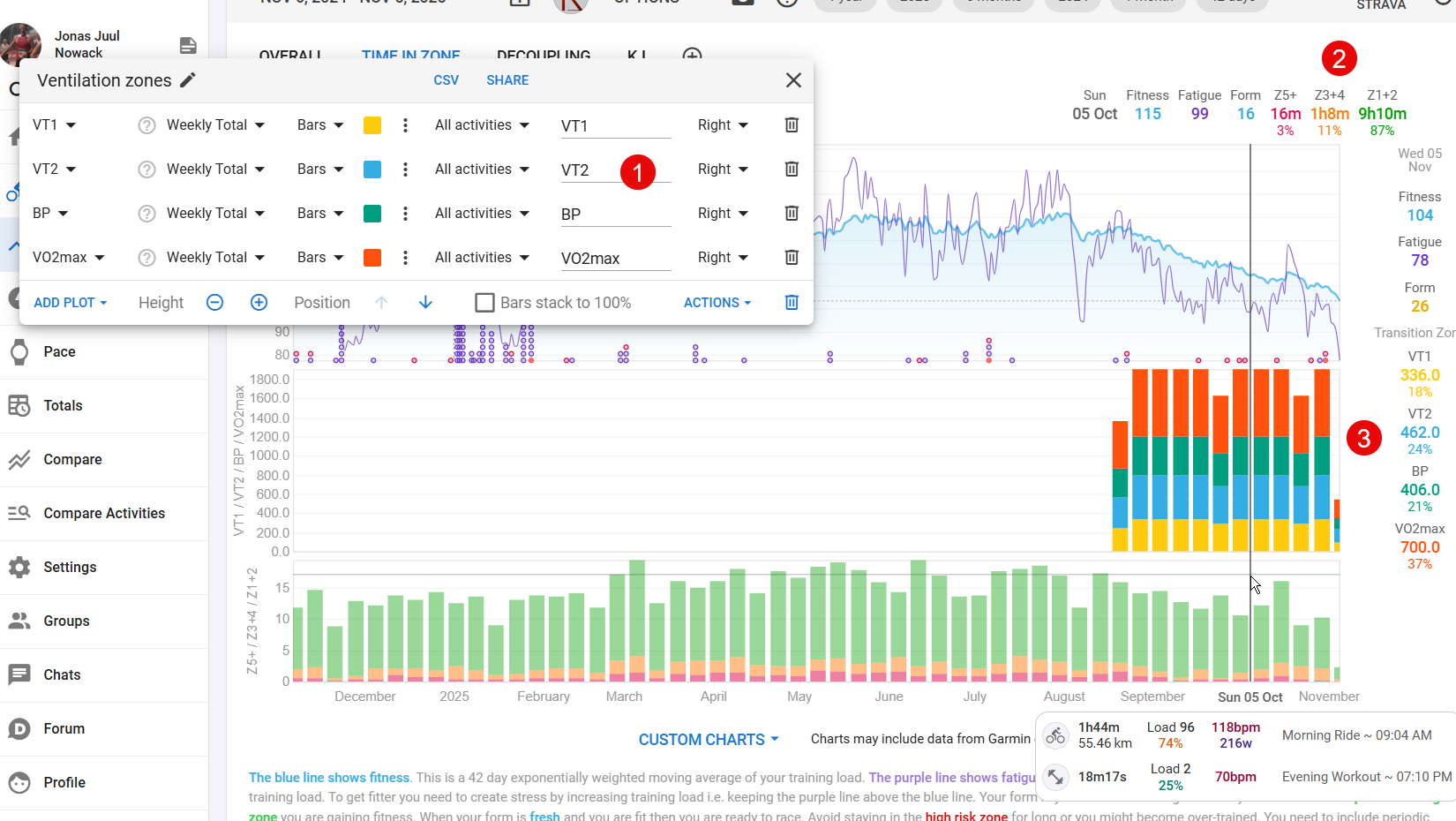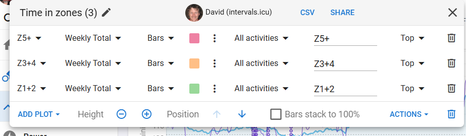 I’d like to see my distribution across the zones both as percentages and in hours/minutes (2), but I can’t seem to get it to work properly (3).