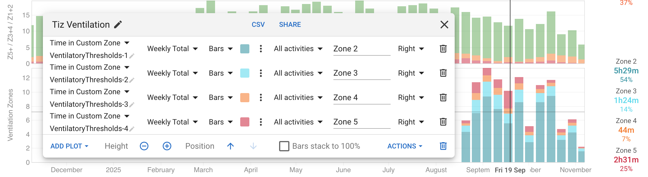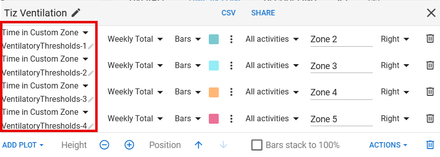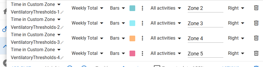 i’ve just received my tymewear vitalpro and tried creating the same chart. the issue is that the chart is totaling actual values from each activity, not the “time in zone” for each plot.
