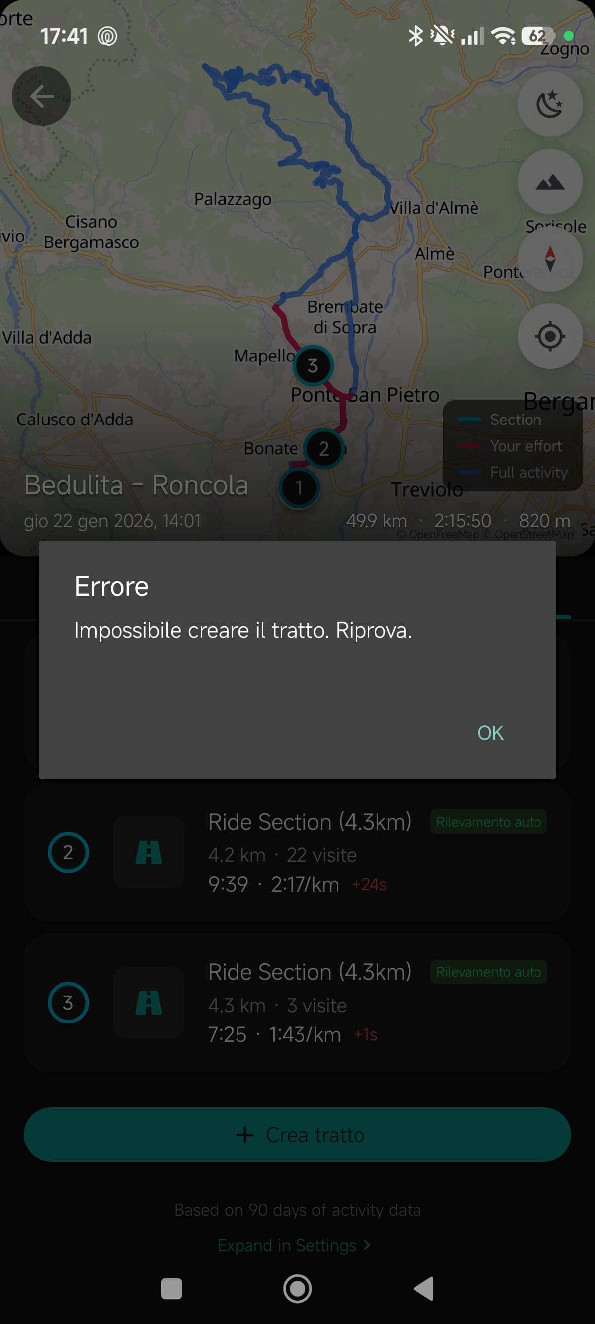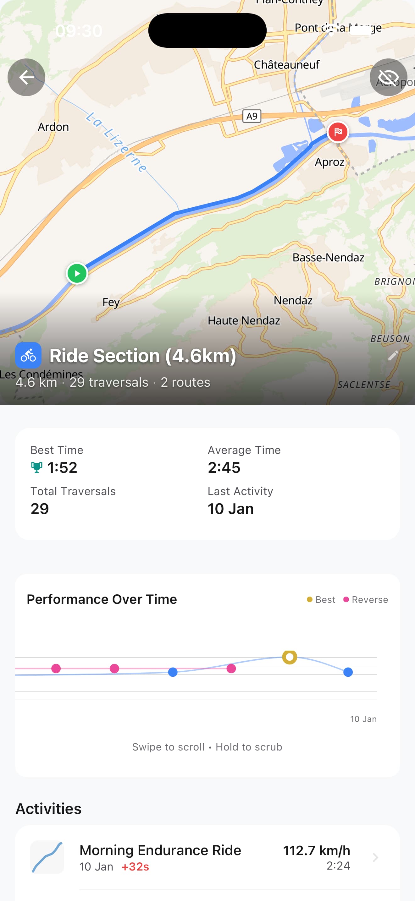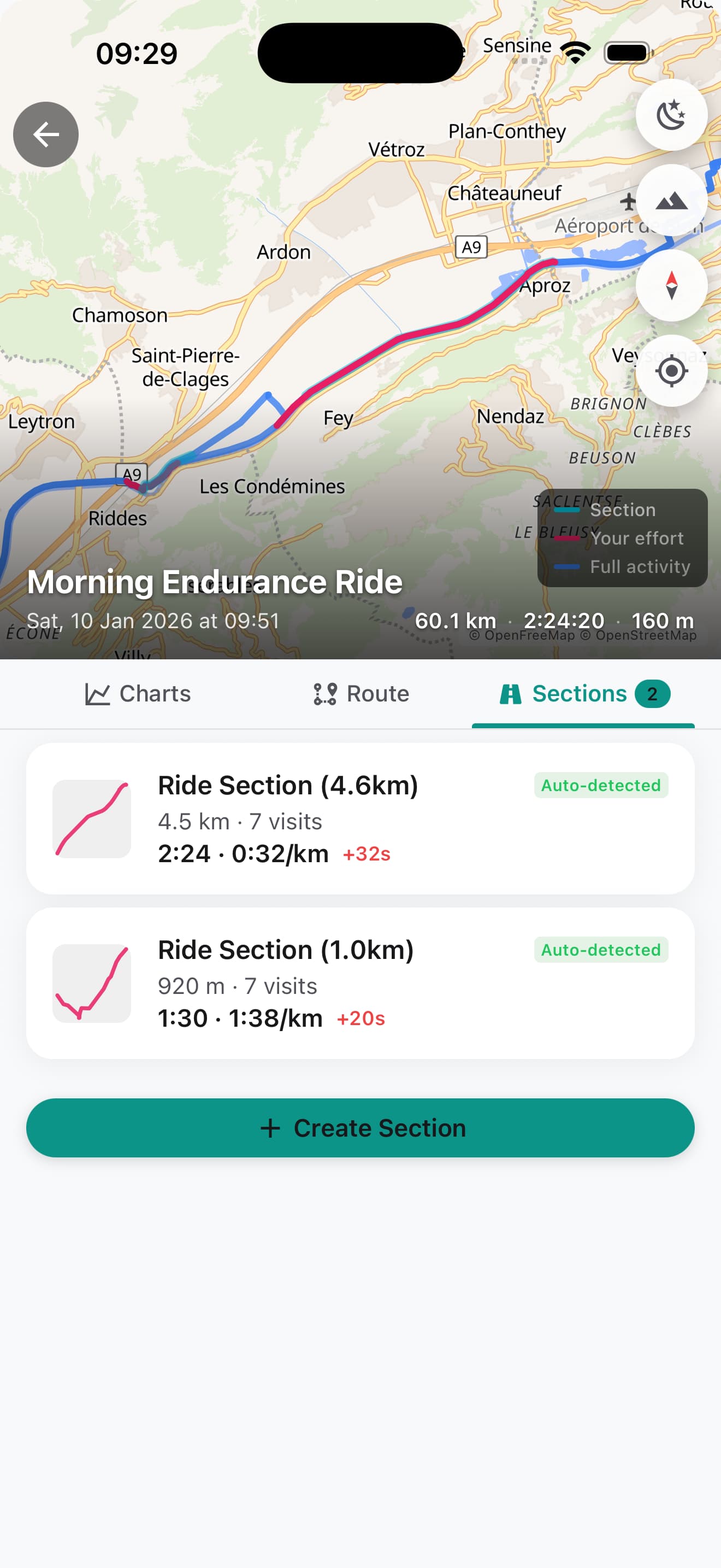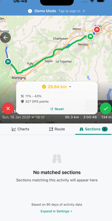 One of the app’s more important features (well at least the one I spent the most time on), is its ability to match routes and automatically generate frequently visited sections to track over time. This is done by caching your activities in memory and running against a library written to match GNSS traces (which still needs some testing and tweaking). And if the auto-generated sections are not enough, you can add your own custom sections to see your progress over time in any of the activities that pass through them.