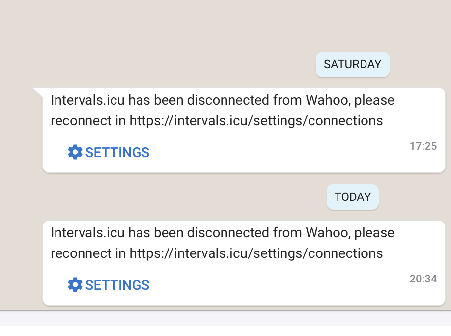 Hi there, further to this (still haven’t got it working-using a workaround) I have now had two messages from internals saying wahoo has been disconnected and requesting reconnection. I am also still seeing the red unable to get data from wahoo banner.