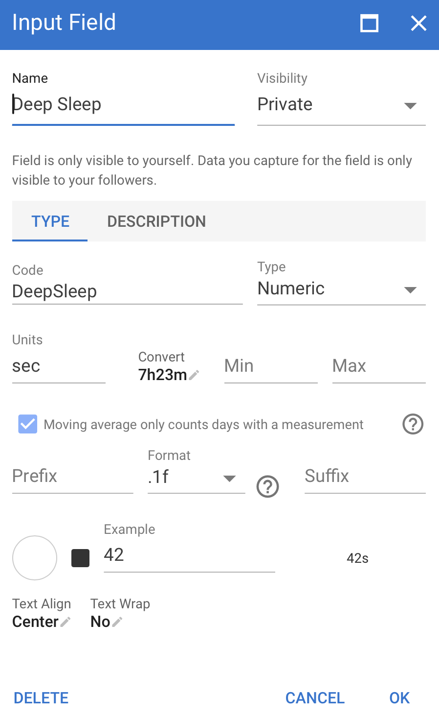 I set up some sleep custom fields I fill manually: Deep sleep, REM sleep, Total sleep. They are expressed in seconds, and I want to write them down in hrs:m. I.e., I write them down like “1h30m” and it gets converted to “1” automatically. The only way to make it work is to convert the field to “Text”. Is that correct? Don’t think so…