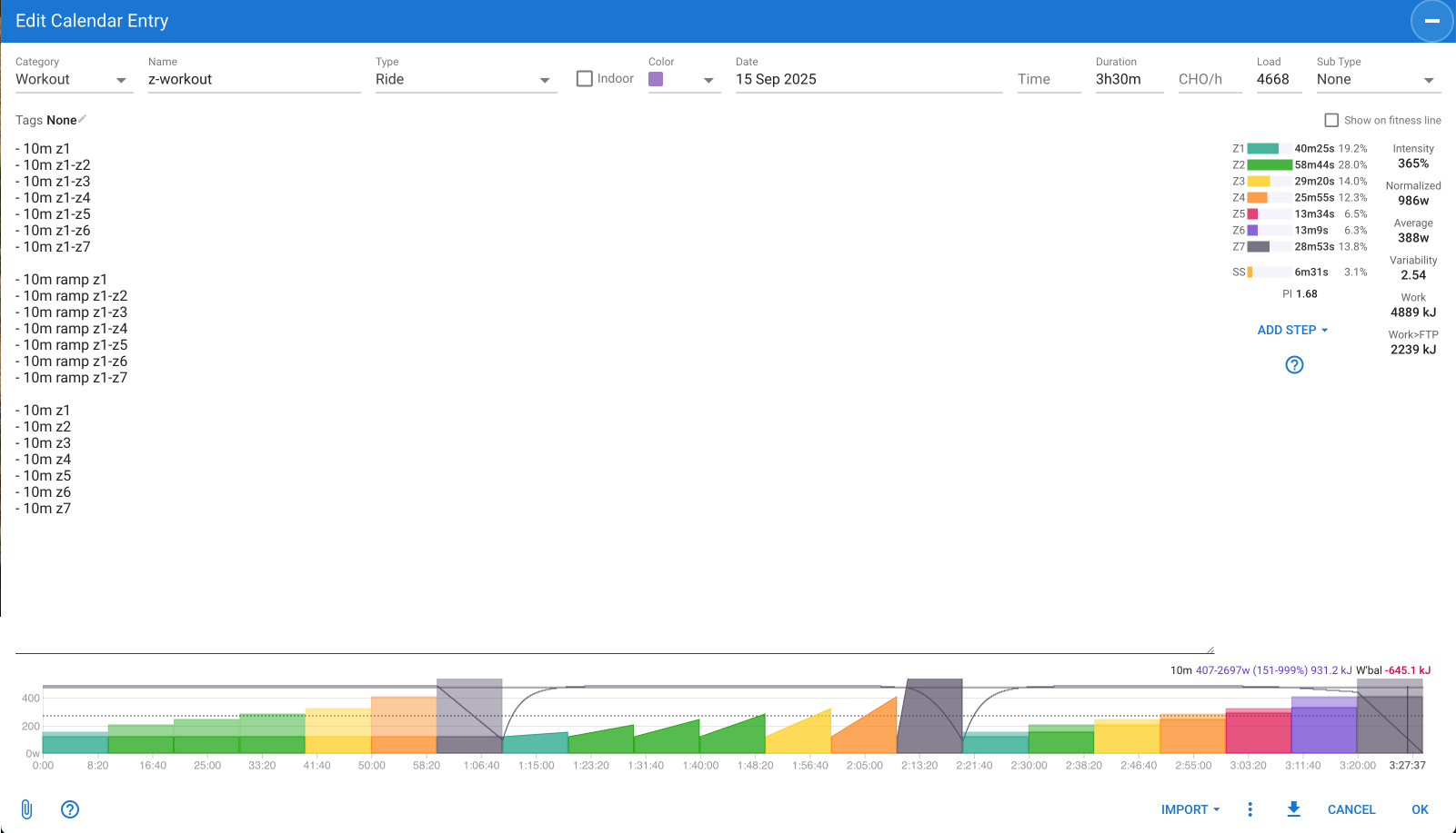 , with my current FTP (it will use “indoor FTP” if the “indoor” box is checked in the workout builder).