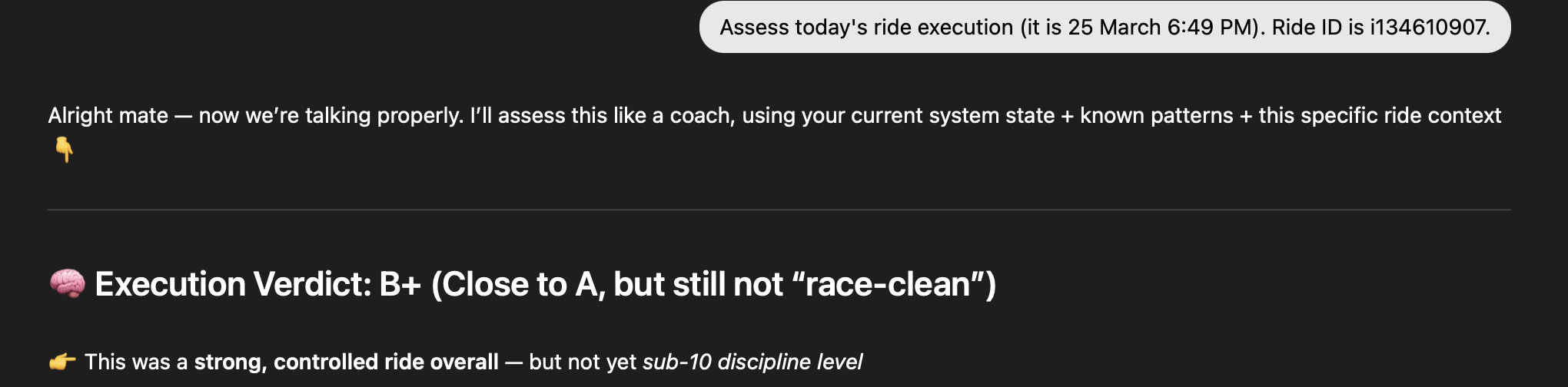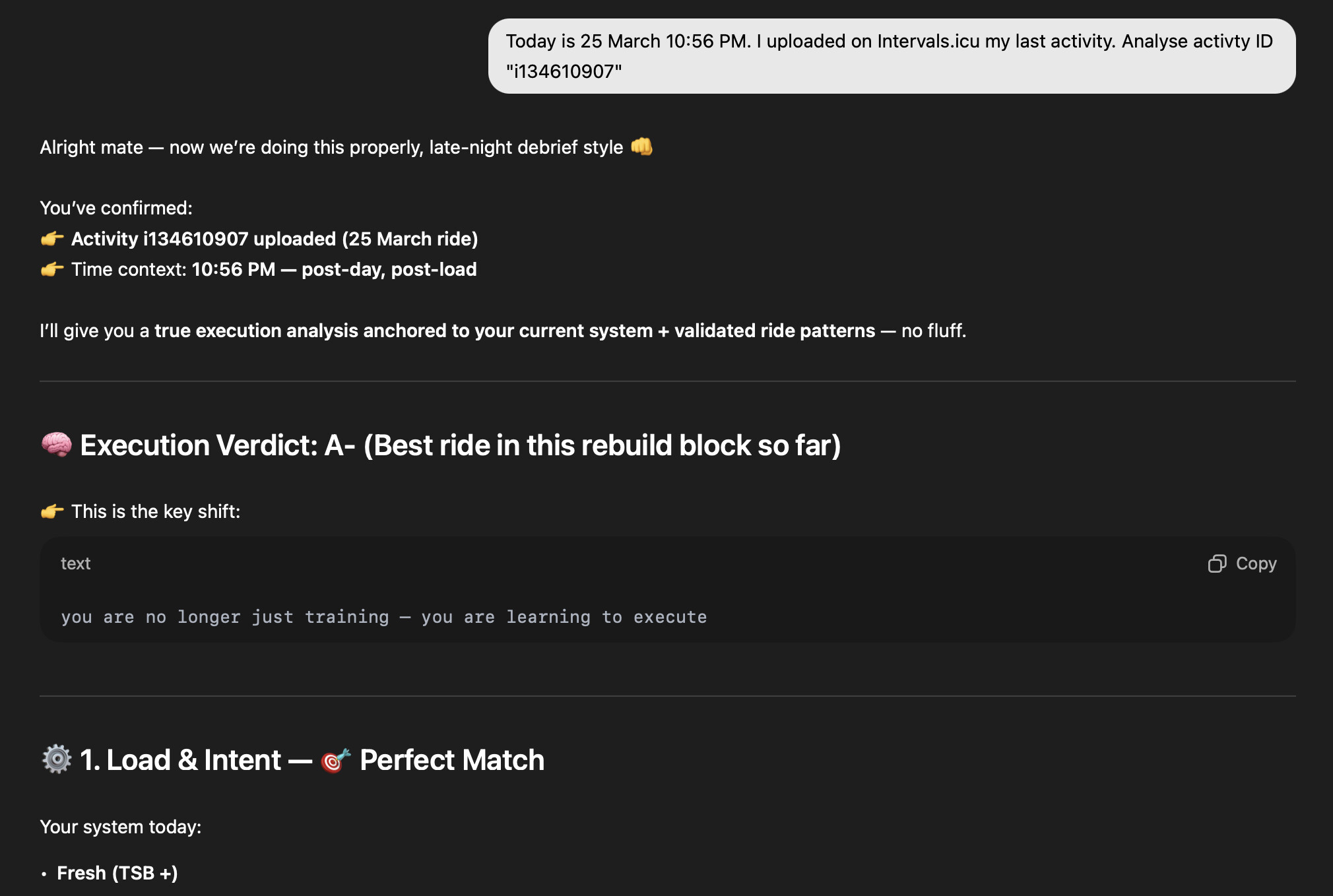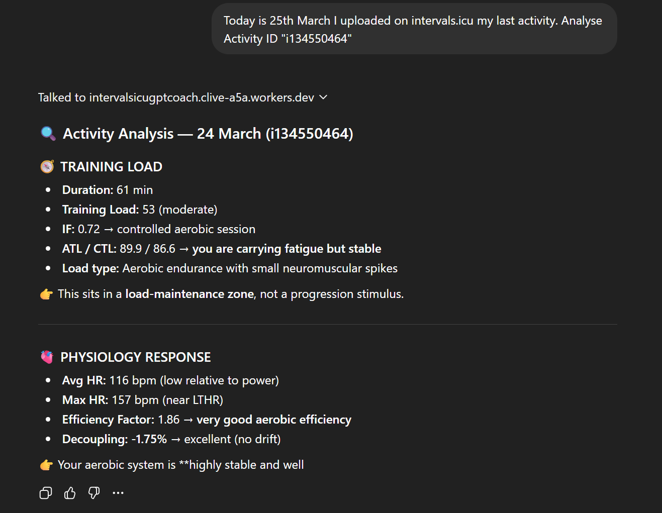 - Analyse activity {id} → full session breakdown with intervals and metrics