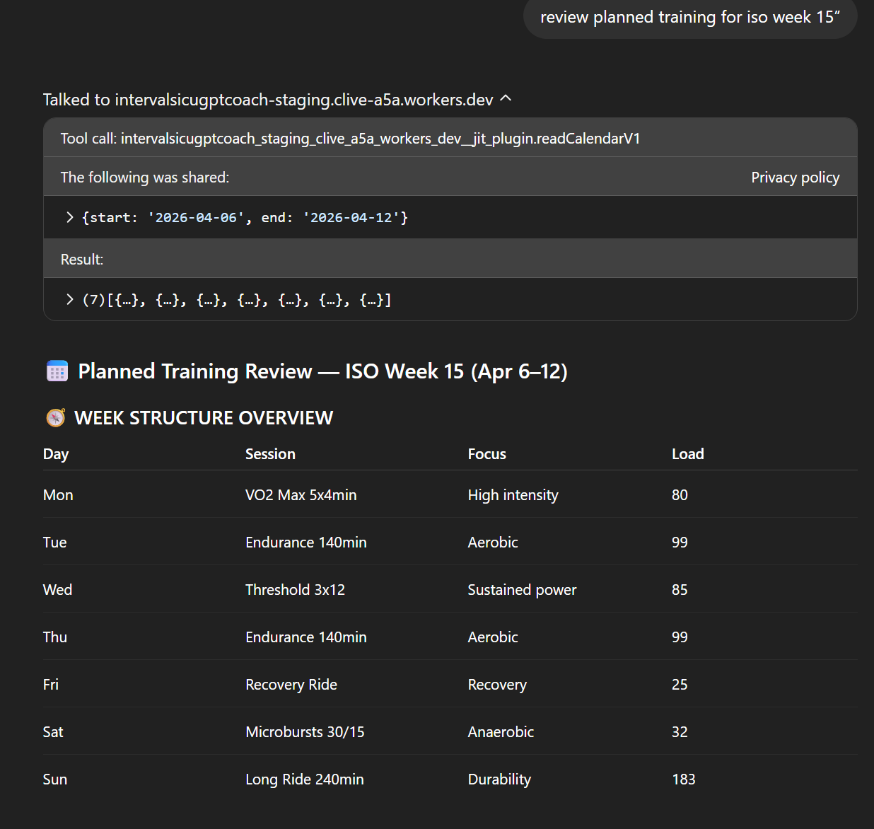 - Get training plan → structured upcoming training schedule