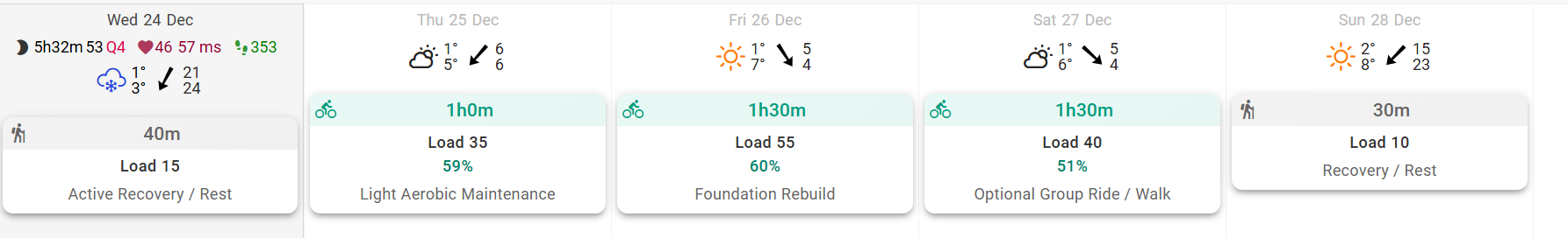 | Dec 27 | Tempo Builder | 80 | 2×20 min @ 85 % FTP |